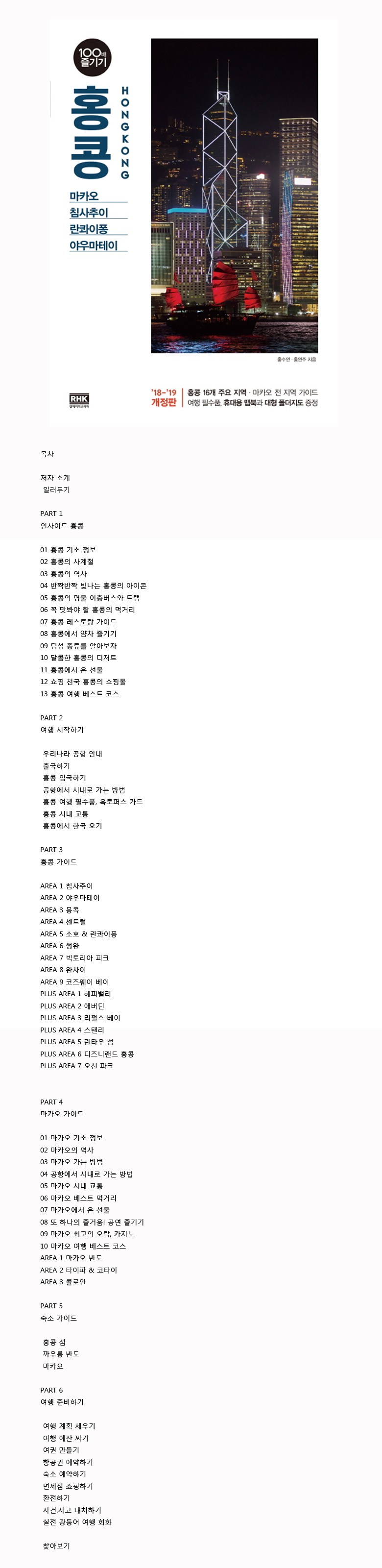 하늘 높이 솟은 센트럴의 마천루, 빌딩 숲을 누비는 이층버스와 피크트램, 빅토리아 항구의 페리, 홍콩의 밤 풍경을 대표하는 레이저쇼, 상시 세일 중인 나이트 마켓과 쇼핑 스트리트, 꼭 한번 먹어봐야 할 중국 4대 진미와 미디어 먹방 여행에 빠지지 않는 얌차까지. 무한 매력으로 무장한 홍콩을 제대로 여행할 수 있도록 하였다. 홍콩 16개 주요 지역은 물론이고 마카오 전 지역까지 완벽한 가이드가 되어 줄 것이다.