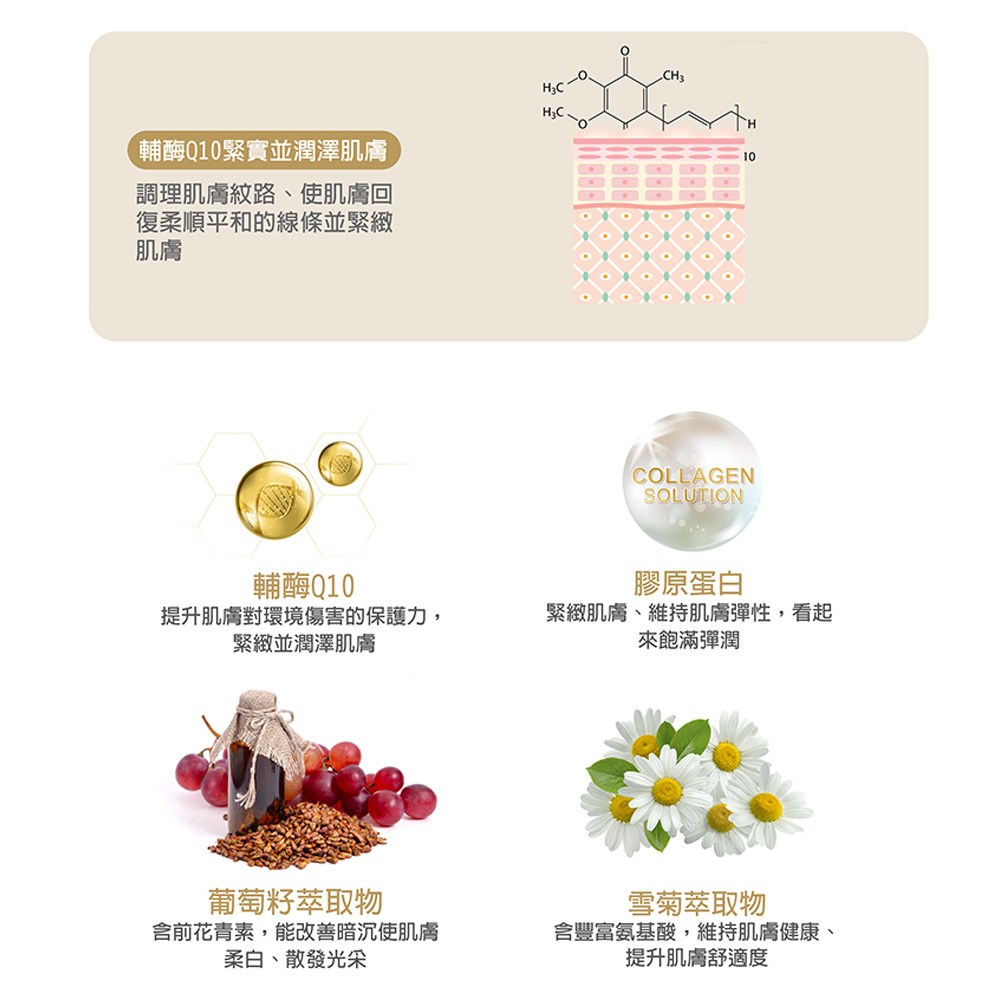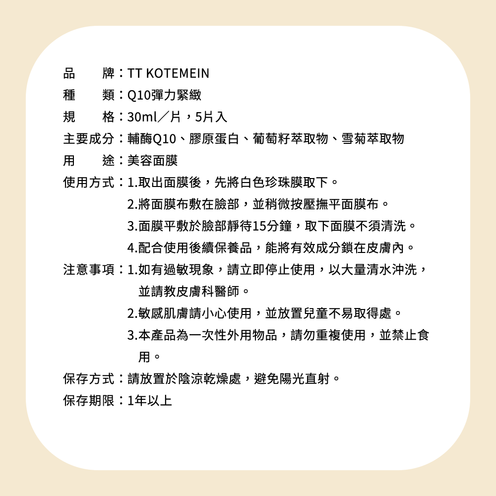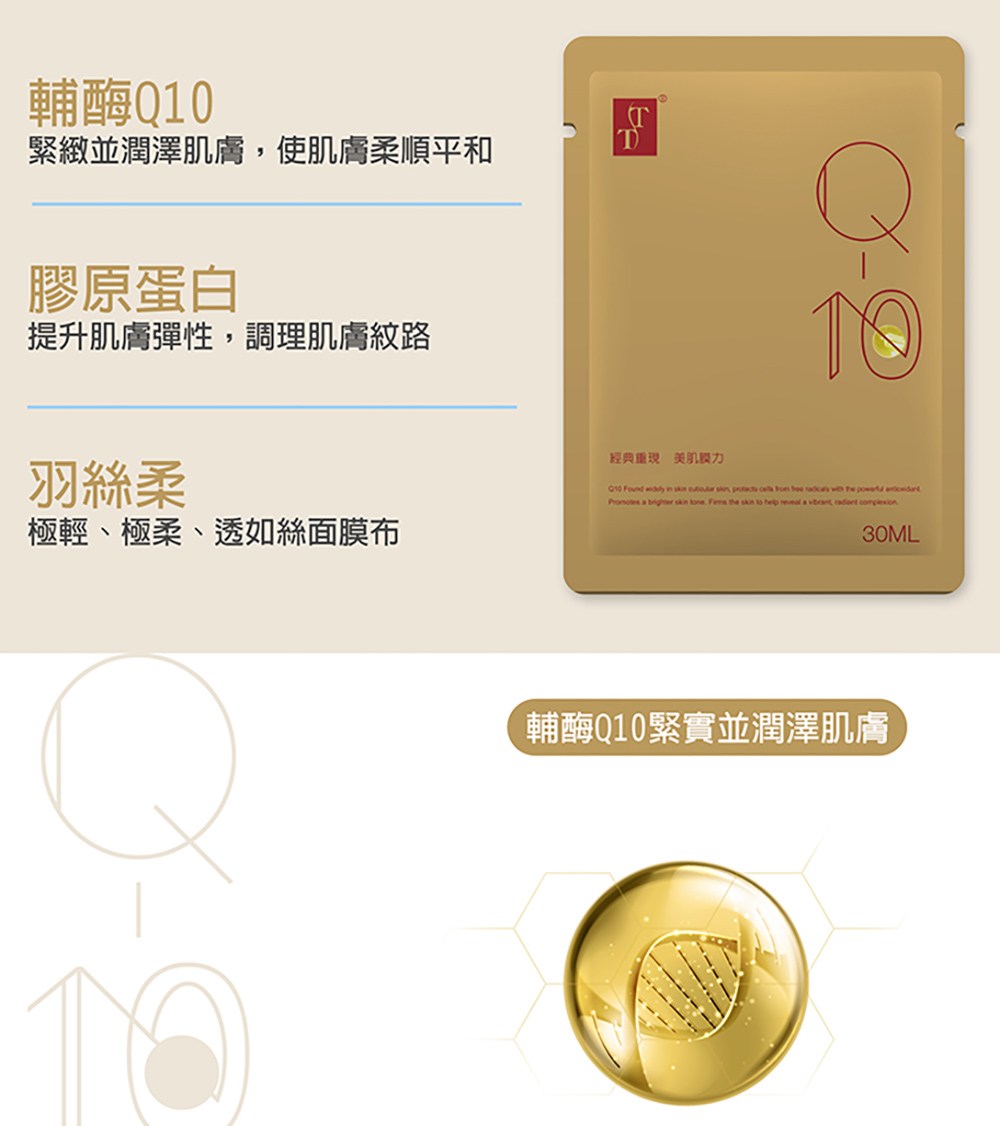 - Q10彈力面膜,讓肌膚體驗深層滋潤,重現水嫩光澤,感受肌膚煥發的活力與彈性。