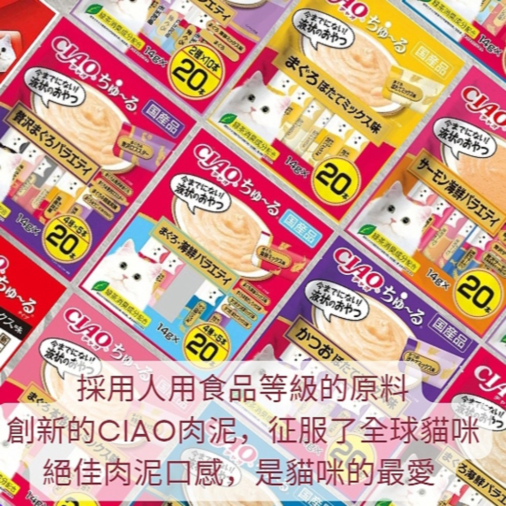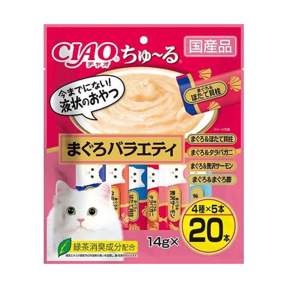 INABA CIAO 啾嚕肉泥 14g*20入 添加綠茶成分, 鮪魚&干貝 + 鮪魚&蟹肉 + 鮪魚&鮪魚片 + 鮪魚&鮭魚, 280g, 1袋