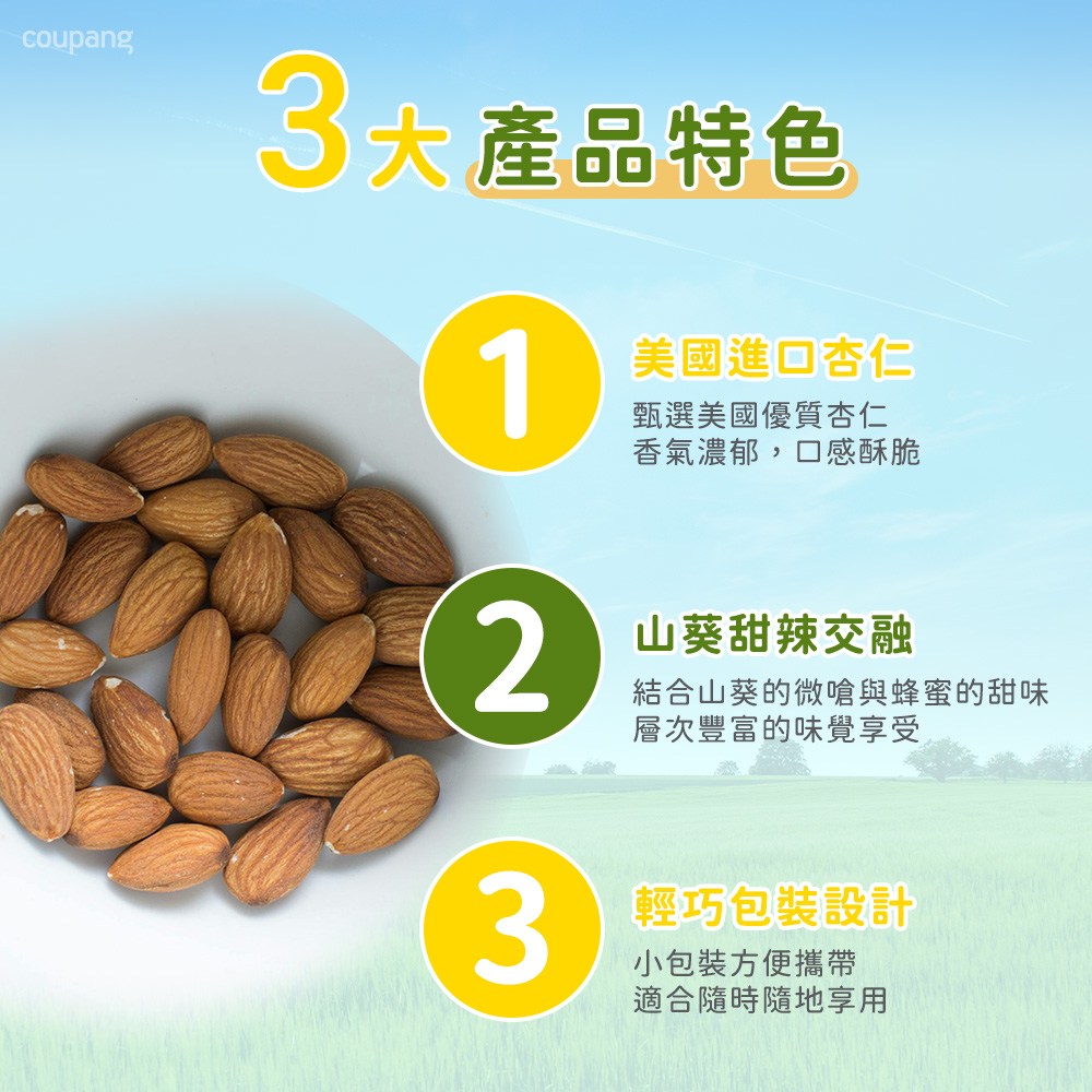 - 獨立小包裝設計,方便攜帶與分享,隨時隨地享受美味的杏仁果。