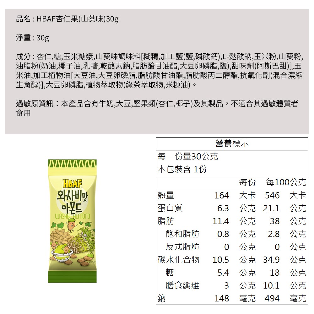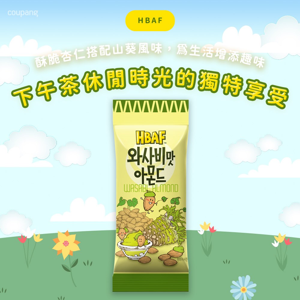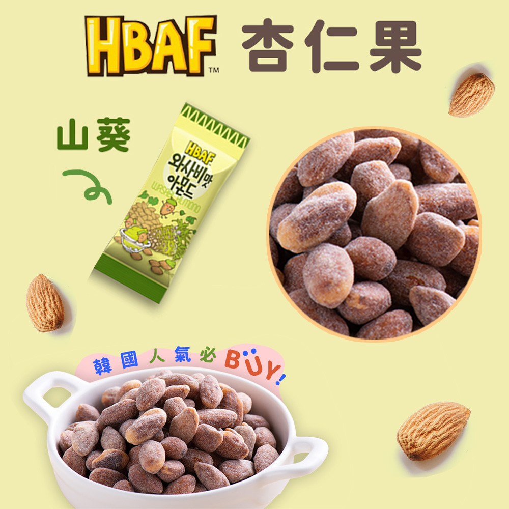 HBAF 山葵味杏仁果,給您帶來獨特的味覺體驗!嚴選美國進口杏仁,經過烘烤後,裹上濃郁的山葵調味,每一口都充滿了香脆和微嗆的刺激感。獨立小包裝設計,方便攜帶,隨時隨地享受美味。無論是下午茶點心、辦公室零食,還是與朋友分享,都是絕佳的選擇。快來體驗這款韓國人氣必BUY的零食,讓您的味蕾感受不一樣的驚喜!