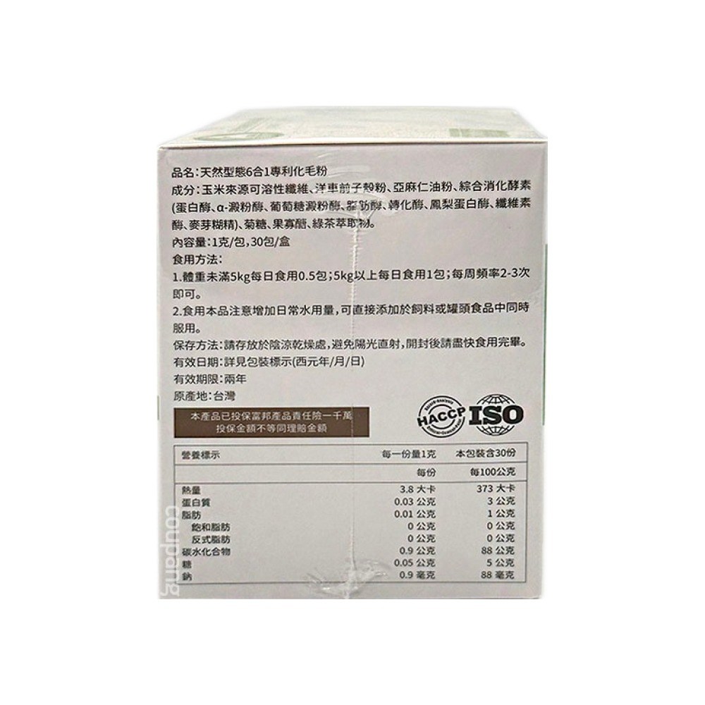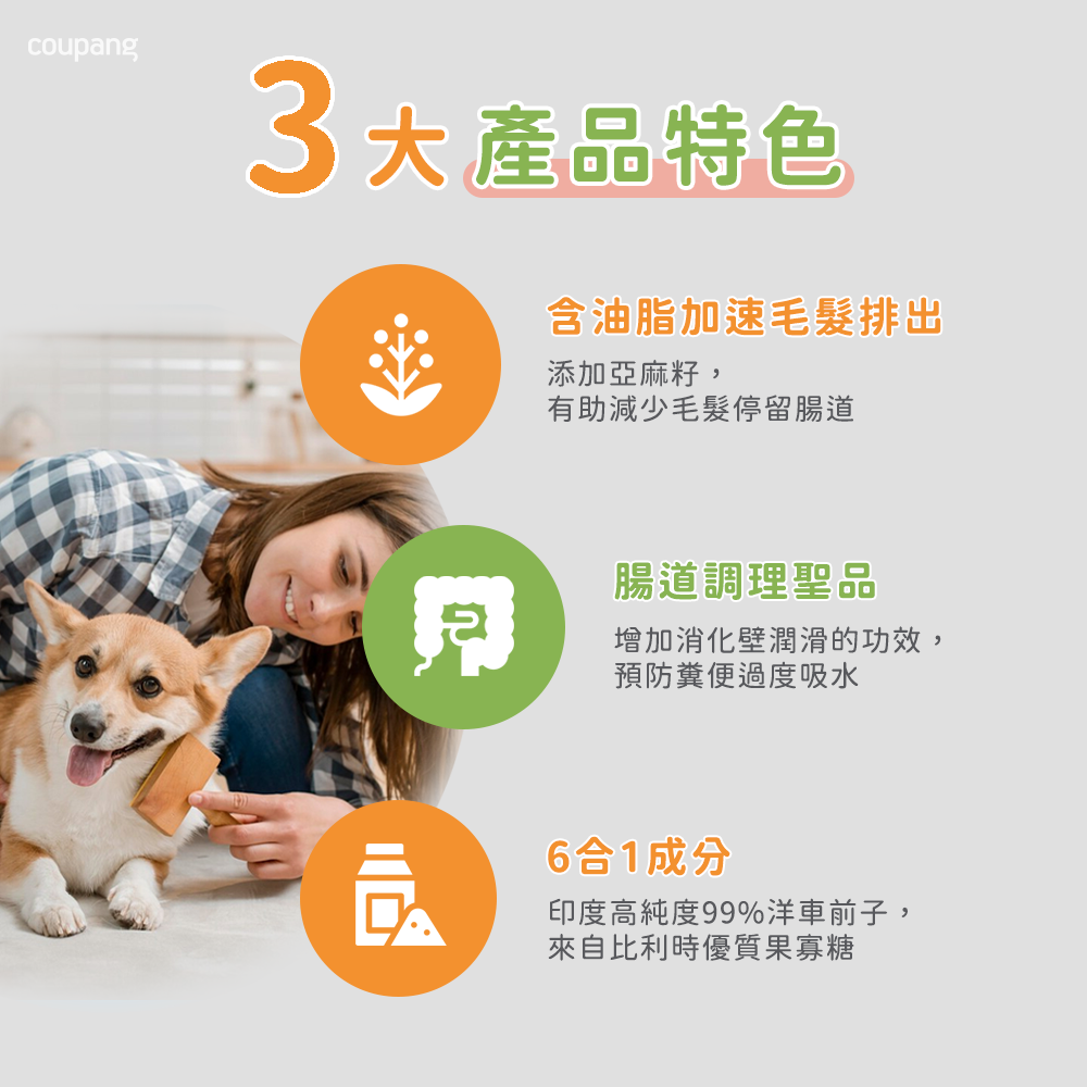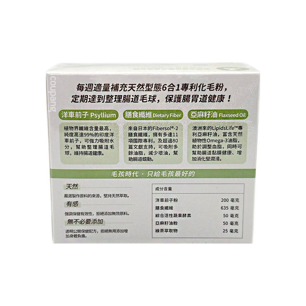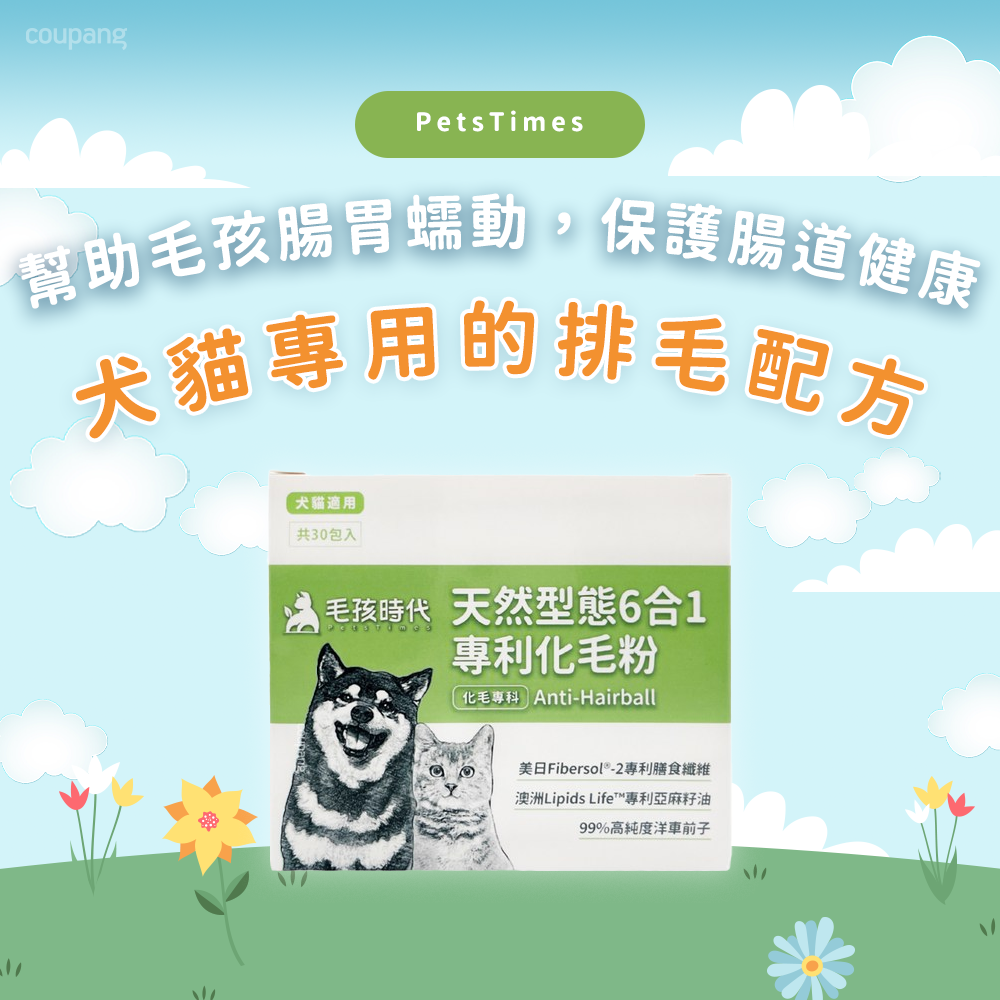 毛孩時代天然型態6合1專利化毛粉,是專為貓狗設計的腸胃保健聖品。每盒包含30包獨立包裝,方便餵食,如專利膳食纖維、亞麻籽油及綜合酵素,有助於促進腸道蠕動,減少毛髮在腸道中的停留,並幫助消化。99%高純度洋車前子,能有效吸水膨脹,幫助毛孩順利排出毛球,維持腸道健康。本產品無添加人工色素及香料,讓毛孩吃得安心,家長也放心。