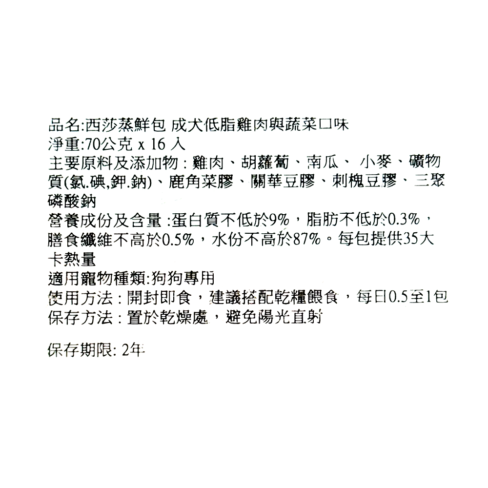 - - 西莎蒸鮮包選用鮮嫩雞肉,搭配多種蔬菜,口感豐富,讓狗狗享受美味的同時,攝取均衡營養。