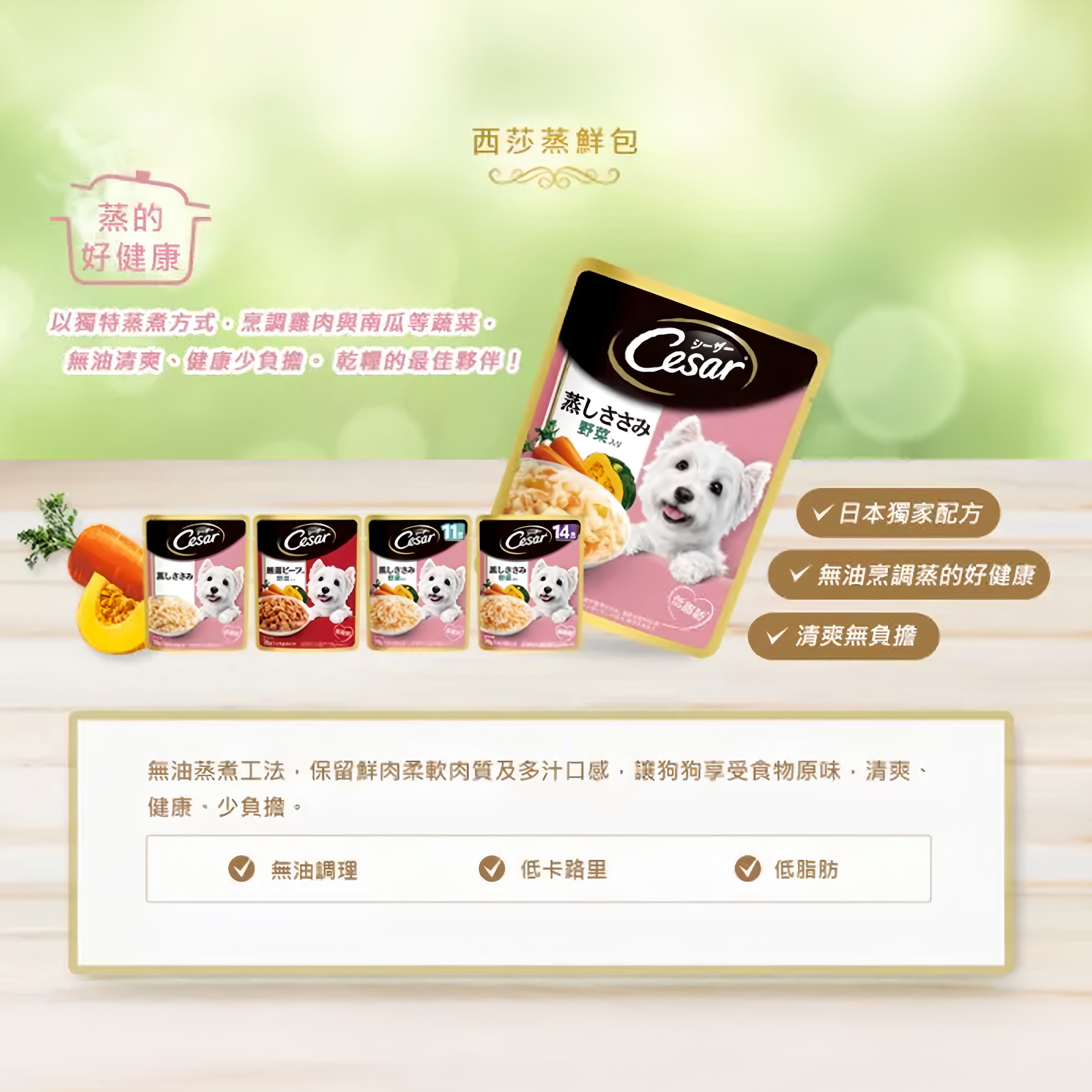 - 西莎蒸鮮包選用特細切雞肉,搭配新鮮蔬菜,口感豐富,讓狗狗享受美味的同時,攝取均衡營養。