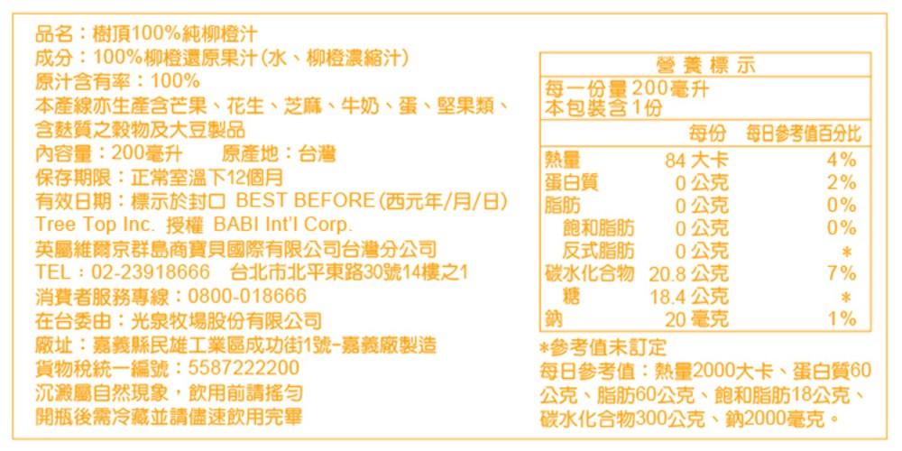 品嚐樹頂100%純柳橙汁!嚴選新鮮柳橙,不添加糖,保留最原始的鮮甜滋味。每包含有200毫升的純果汁,一組六入,方便隨時隨地補充維生素C。無論是早餐、午餐或點心,樹頂柳橙汁都是健康美味的好選擇。讓您和家人一同享受這份來自大自然的恩賜,感受柳橙的活力與健康!