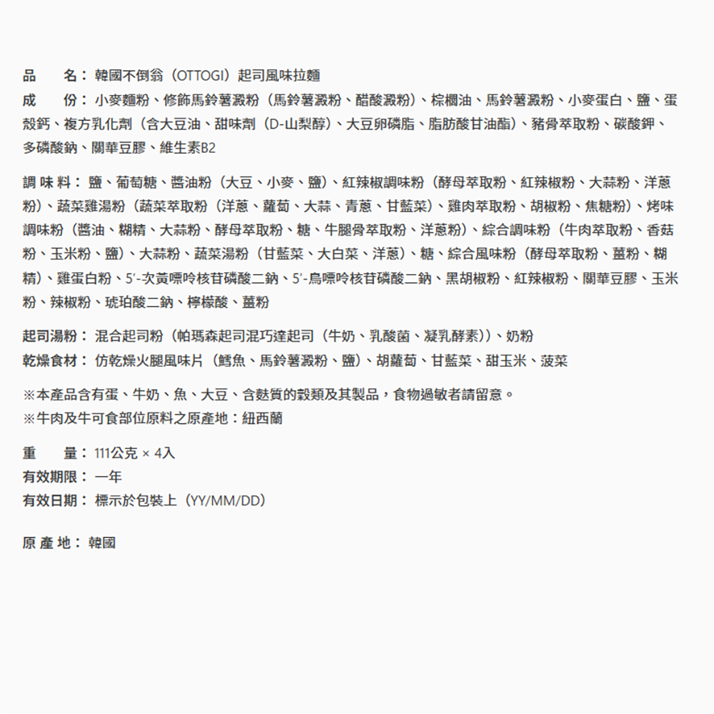 OTTOGI 不倒翁起司風味拉麵,濃郁起司與Q彈麵條的完美結合,在家也能輕鬆享受道地韓式風味。每箱包含8袋,每袋內有4包111g拉麵,份量十足,無論是個人獨享或與家人朋友分享都非常適合。嚴選食材,常溫保存,讓您隨時都能品嚐到美味又安心的起司拉麵。簡單沖泡,快速方便,只需幾分鐘即可享用,是忙碌生活中的最佳選擇。濃郁的起司香氣,搭配Q彈有嚼勁的麵條,給您帶來豐富的味蕾享受。