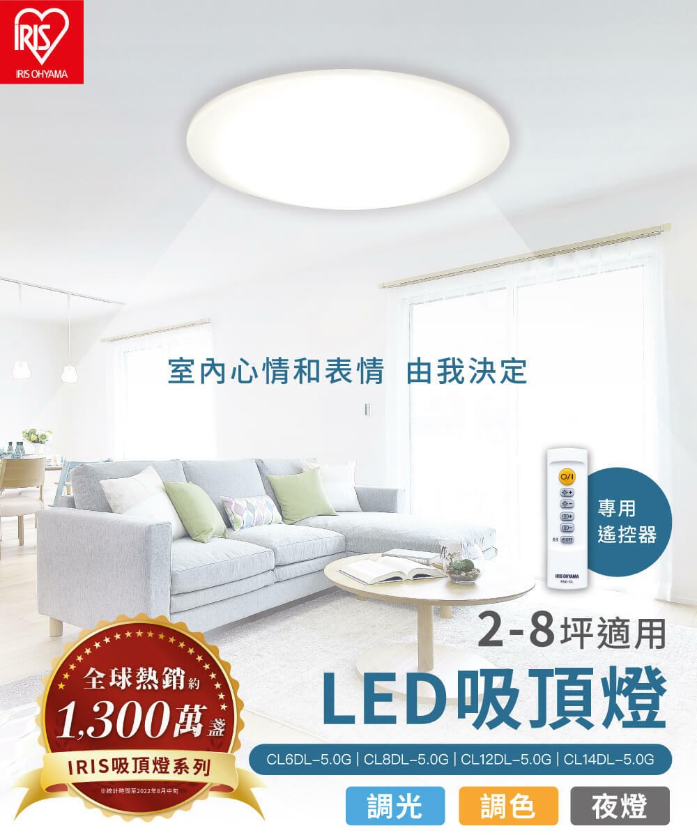 IRIS LED圓盤吸頂燈 CL14DL-5.0G,為您的居家空間帶來明亮且舒適的照明體驗。這款吸頂燈採用先進的LED技術,不僅節能省電,更擁有長達40,000小時的使用壽命,讓您無需頻繁更換燈具。透過專用遙控器,您可以輕鬆調整燈光的亮度與色溫,10段亮度調節和11段色溫調節,無論是溫馨的用餐氛圍、專注的工作環境,或是放鬆的電影時光,都能隨心所欲地調整。此外,它還具備2段夜燈模式,提供柔和的光線,讓您在夜晚也能安心活動。IRIS LED吸頂燈設計簡約時尚,厚度僅9.3公分,能完美融入各種室內裝潢風格,讓您的家更添品味。