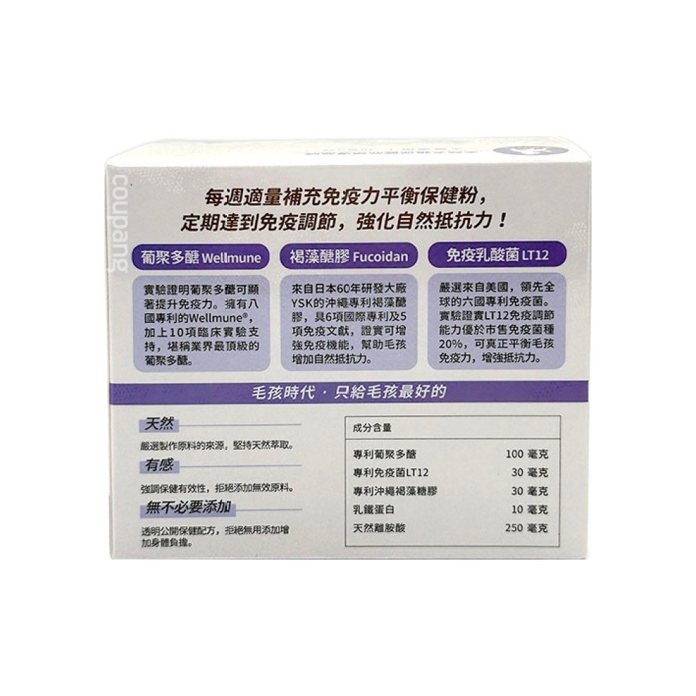 毛孩時代免疫力平衡保健粉,專為犬貓設計,每盒包含30包2克粉末。本產品採用專科保健配方,包含專利成分,如Wellmune®、YSK Fucoidan®和LT12®,經實驗證明能有效提升免疫功能。建議每日搭配罐頭、飼料或水食用,方便餵食,且無添加不必要的成分,確保寵物健康無負擔,讓您的愛寵活力充沛。給毛孩最好的!
