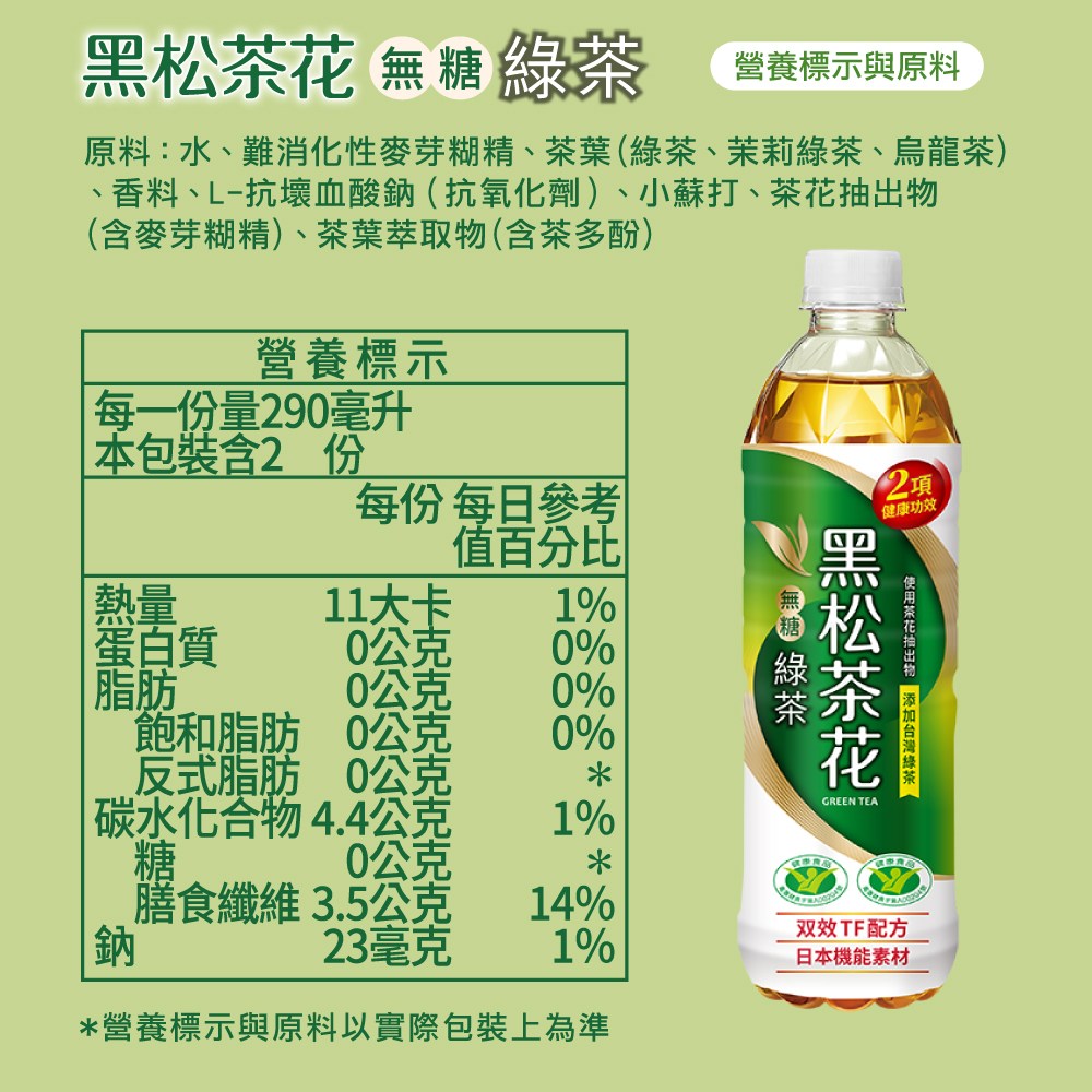 - 享受黑松茶花綠茶的清爽口感,無糖配方讓您隨時享受無負擔的健康茶飲。