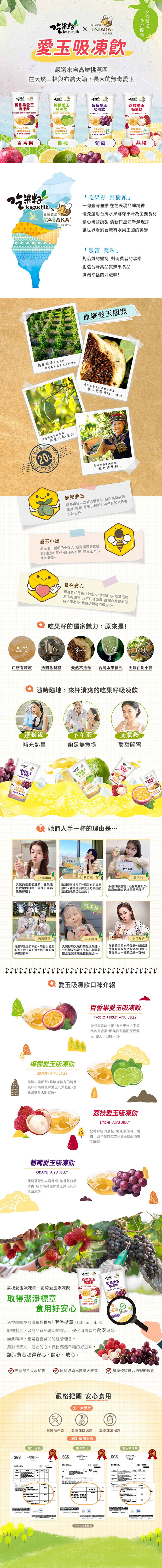 吃果籽愛玉吸凍飲禮盒,內含檸檬口味三入與百香果口味三入,每杯220克,共六入一盒。嚴選來自高雄桃源區的愛玉。檸檬口味帶來清新的酸甜,百香果口味則充滿熱帶水果的濃郁香氣,冰鎮後風味更佳,隨時隨地享受清涼解渴的美味。無論是運動後補充能量,或是下午茶的輕鬆點心,都是健康又美味的選擇。本產品通過FSSC22000與HACCP22000認證,讓您安心享用。