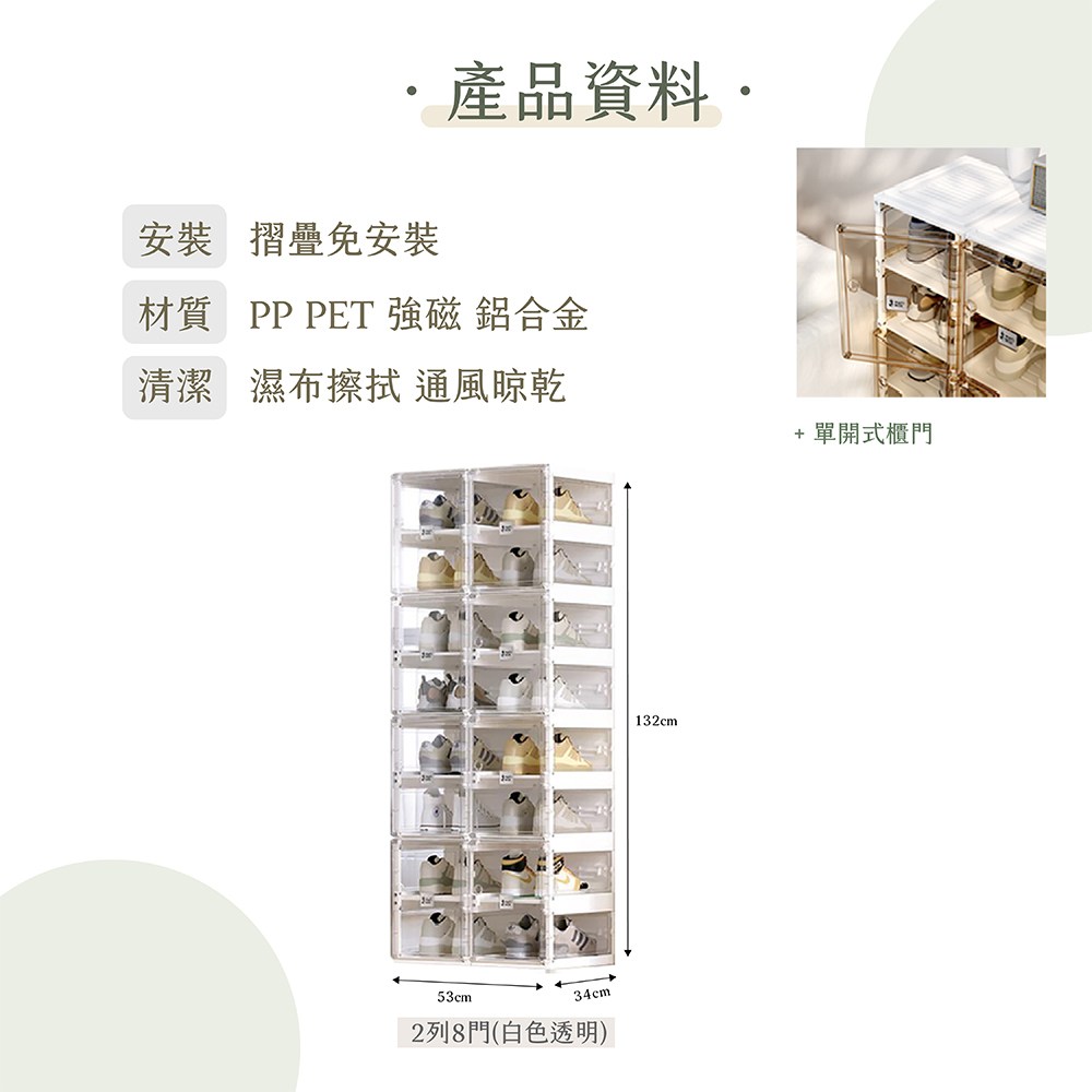 告別雜亂無章的鞋子堆!這款透明免組裝變身鞋櫃,採用淨白透明設計,讓您一目瞭然鞋子的款式,輕鬆找到想穿的鞋。53*34*132公分的尺寸,提供8層收納空間,可容納多雙鞋子,滿足您的收納需求。免組裝設計,拆箱即可使用,省時省力。櫃體採用PP材質,堅固耐用,不易變形,透明門板採用PET材質,防塵防潮,讓您的愛鞋保持乾淨整潔。磁吸式門板,開關方便,密封性好。