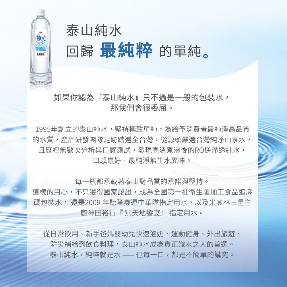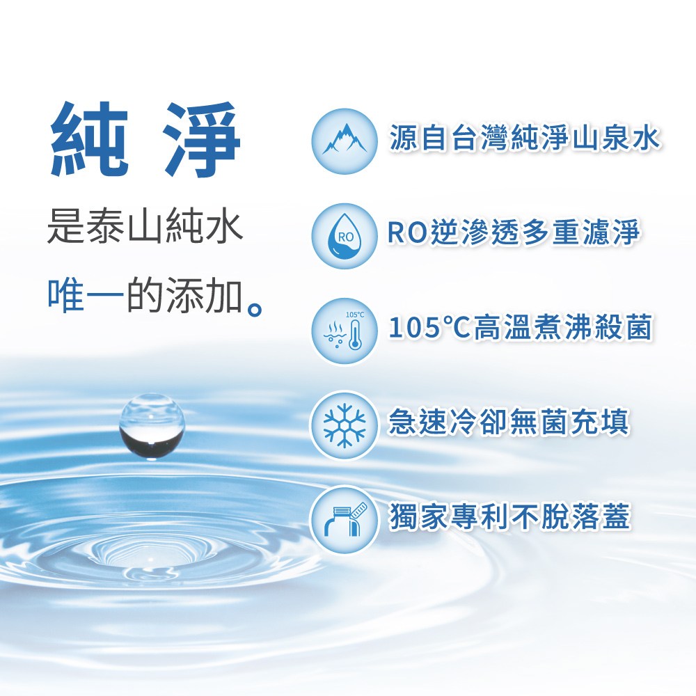 - 泰山純水口感清甜,隨時補充水分,維持身體健康機能,讓您活力充沛。