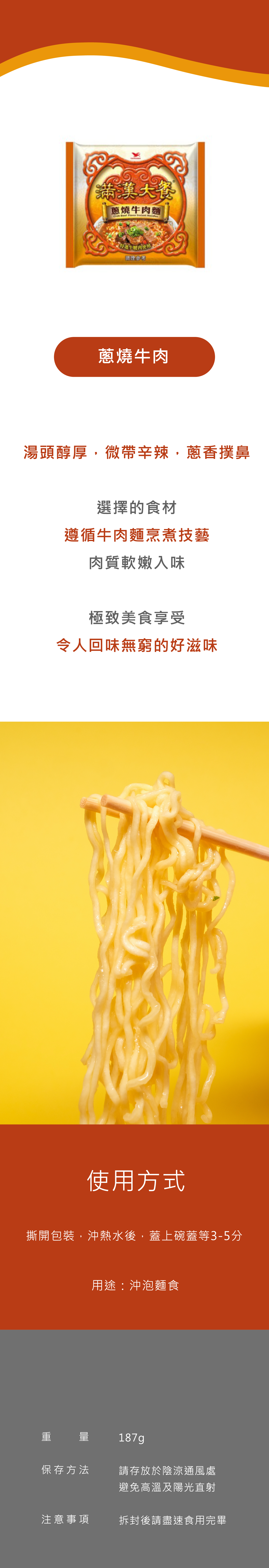 | 商品名稱 | 滿漢大餐 蔥燒牛肉麵 | 原產地/國 | 台灣 |