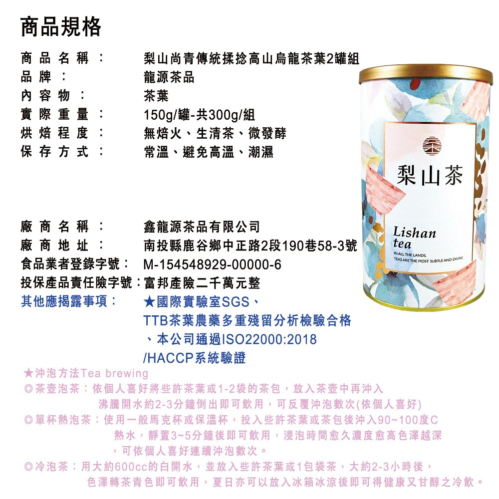 品嚐來自台灣梨山的高山烏龍茶,體驗尚青傳統揉捻工藝的精髓。龍源茶品 鑫龍源 梨山尚青傳統揉捻 高山烏龍茶葉,嚴選海拔2000公尺以上茶區,以確保茶葉的卓越品質和獨特風味。每組包含兩罐150克的茶葉,讓您盡情享受這款茶的甘醇與芬芳。此茶葉經過SGS檢驗,保證100%台灣原產,無農藥殘留,讓您安心品茗。無論是自用或送禮,這款高山烏龍茶都是絕佳選擇,帶給您清新自然的味覺享受。