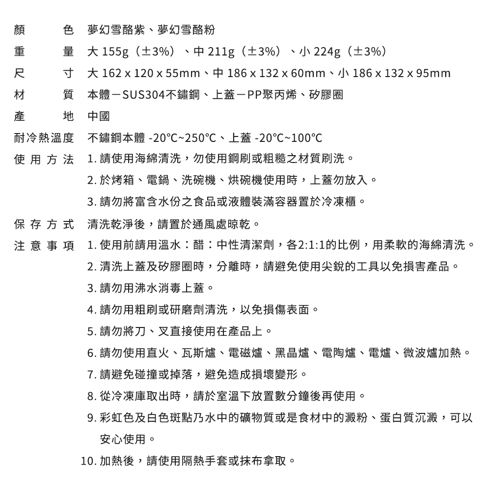 - 三種容量組合,滿足不同食物分量需求,輕鬆應對各種料理情境。