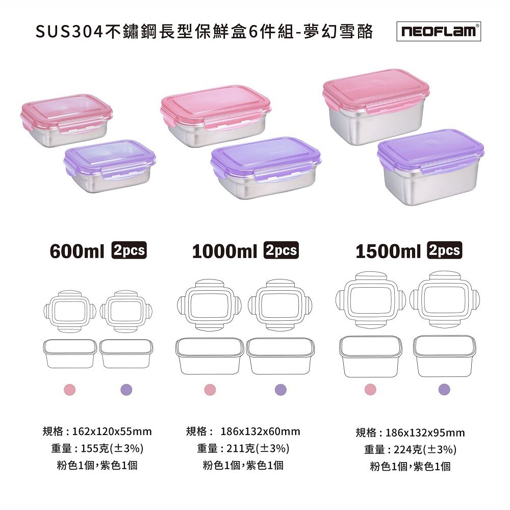 NEOFLAM夢幻雪酪不鏽鋼保鮮盒套裝,為您的廚房增添一抹夢幻色彩!這款套裝包含6個長方形保鮮盒,容量分別為600ml、1000ml和1500ml,每個尺寸各兩個,滿足您不同的儲物需求。採用食品級SUS304不鏽鋼材質,安全耐用,抗腐蝕,不釋放有害物質,讓您安心儲存各種食材。夢幻雪酪配色(夢幻雪紫、夢幻雪粉),為您的餐桌增添美感。不僅如此,此款保鮮盒還可堆疊收納,節省空間,讓您的廚房更加整潔有序。密封性極佳,有效延長食物保鮮期,是您廚房收納的理想之選!