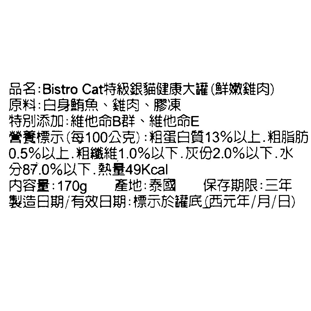 為您的愛貓提供 [箱裝] 惜時 Birstro Cat 特級銀貓健康大罐,鮮嫩雞肉口味,每罐170克,一箱24罐裝,讓您一次購足,省時省力。這款濕糧採用鮮嫩雞肉為主要原料,富含優質蛋白質,有助於維持貓咪的肌肉健康和活力。特別添加維生素B群和維生素E,呵護貓咪的皮膚健康和毛髮亮麗。適口性佳,全齡貓咪皆可食用,是您為愛貓提供均衡營養的理想選擇。產地泰國,品質保證,讓您的愛貓吃得安心又健康。
