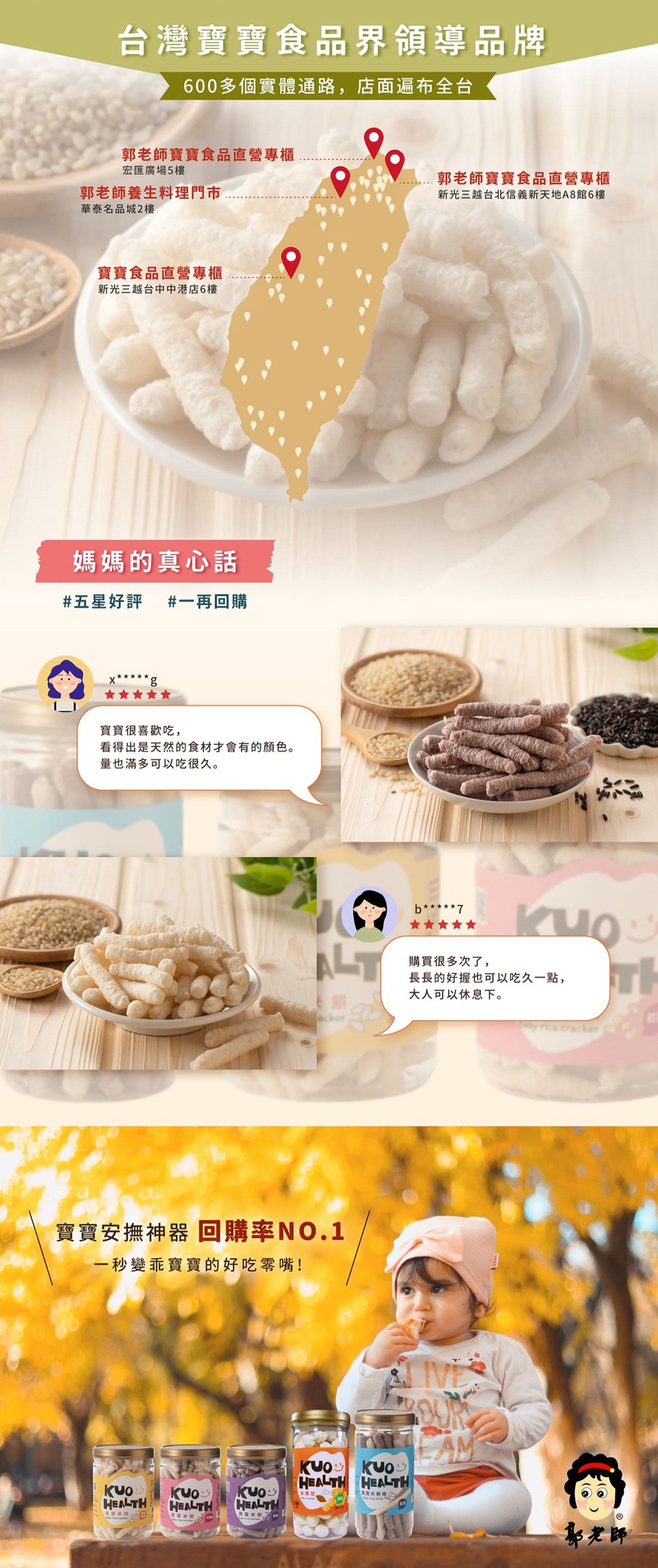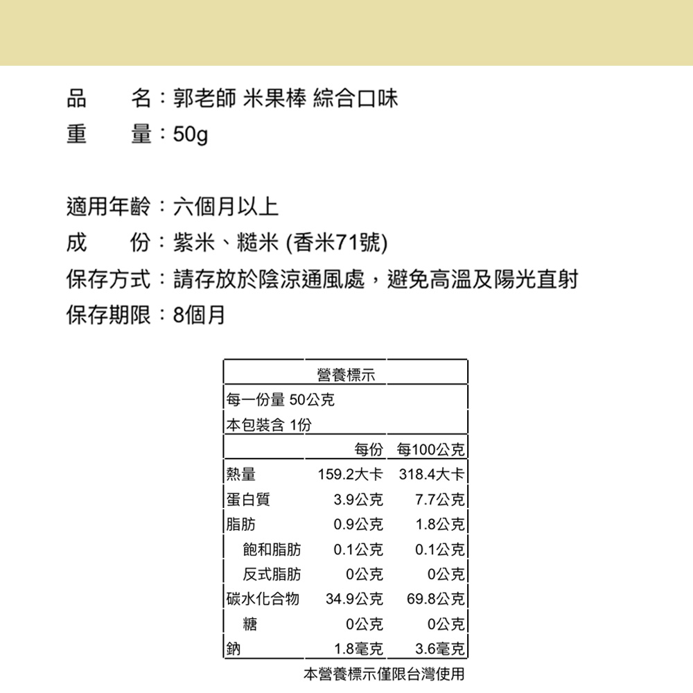- 郭老師米果棒,口感酥脆易融化,適合六個月以上寶寶抓握食用,訓練手眼協調。
