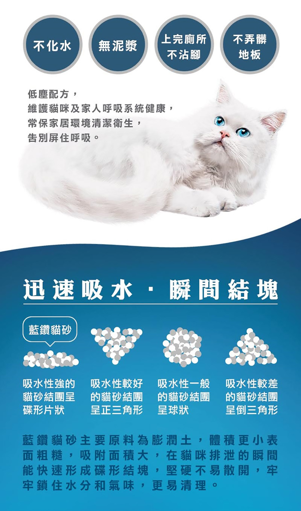 - 藍鑽貓砂能迅速吸收水分,形成堅固的凝塊,方便清理貓砂盆,讓鏟屎官輕鬆省力。