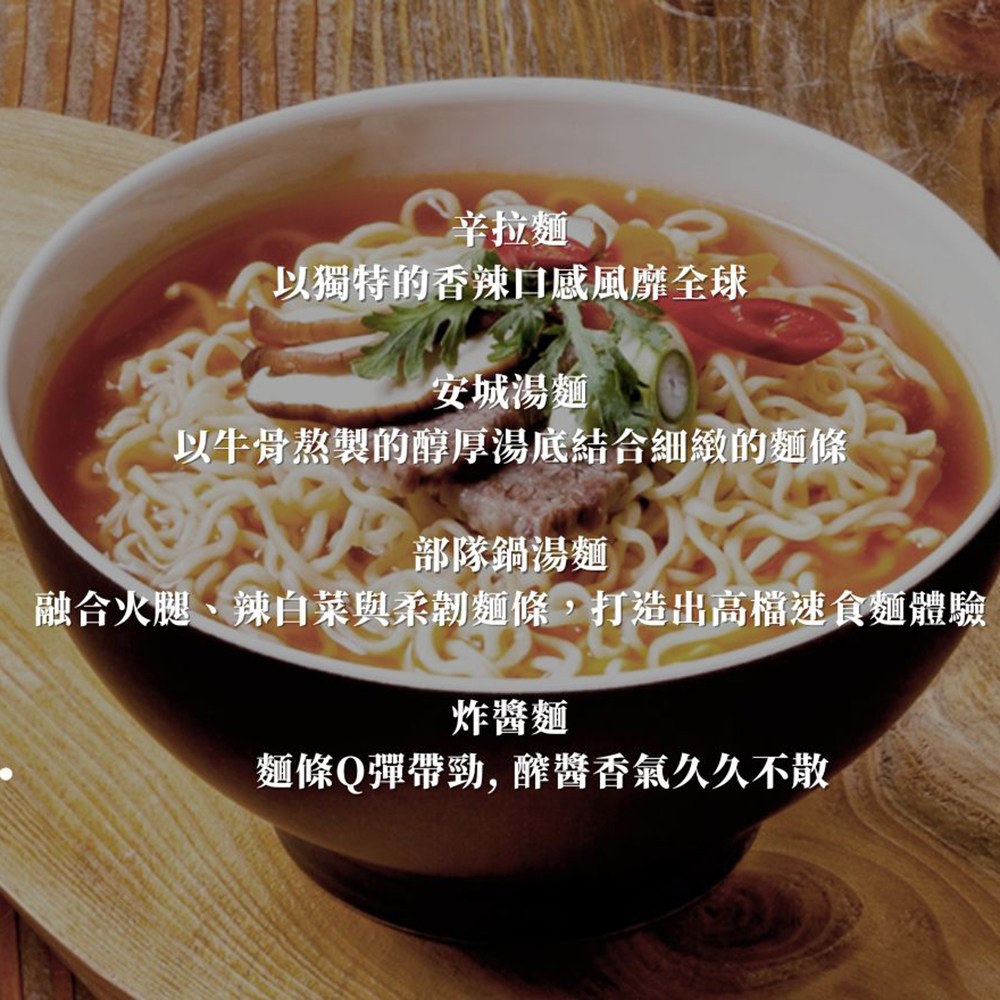 - 農心頂級辛拉麵,微辣牛骨湯風味,湯頭濃郁,口感豐富,讓您享受道地韓國風味。