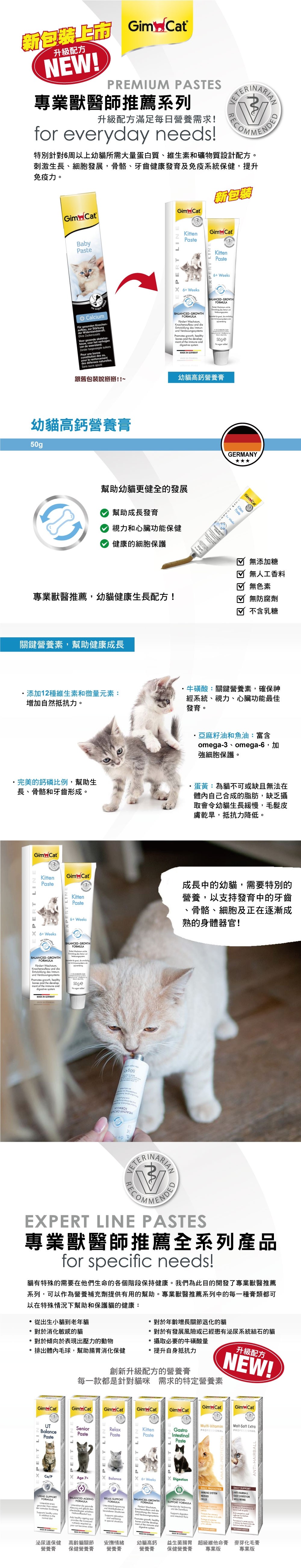 - 膏狀質地細膩柔滑,易於幼貓舔食吸收,補充成長所需鈣質,美味又營養。