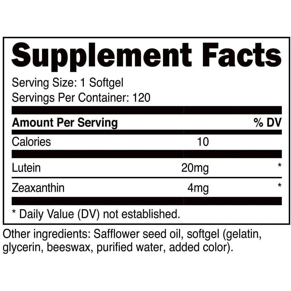 제아잔틴 식이 보조제입니다. 1인분 당 10칼로리, 루테인 20mg, 제아잔틴 4mg를 제공합니다.