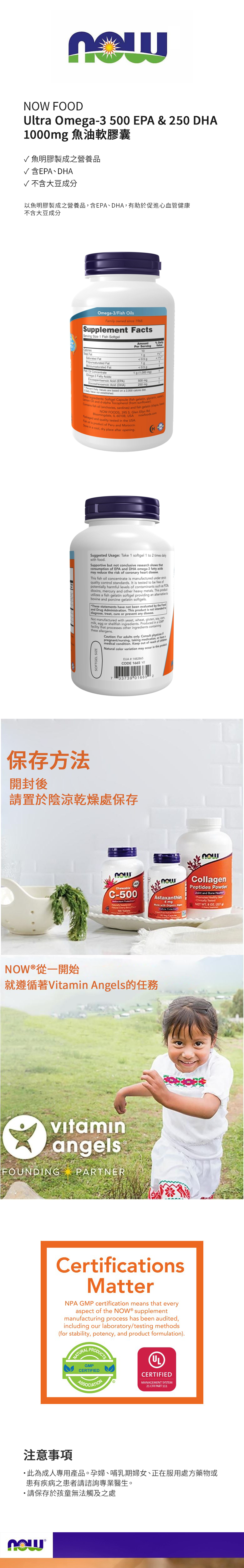 NOW Foods Ultra Omega-3魚油軟膠囊提供高品質的Omega-3脂肪酸,每粒含500毫克EPA和250毫克DHA,有助於促進心血管健康。本產品採用魚明膠軟膠囊,不含大豆成分,適合對大豆過敏的人士。經過分子蒸餾,確保產品不含重金屬等汙染物。每日服用1至2粒,即可輕鬆補充Omega-3,維持身體機能。本產品在美國製造,並經過嚴格的品質檢測。