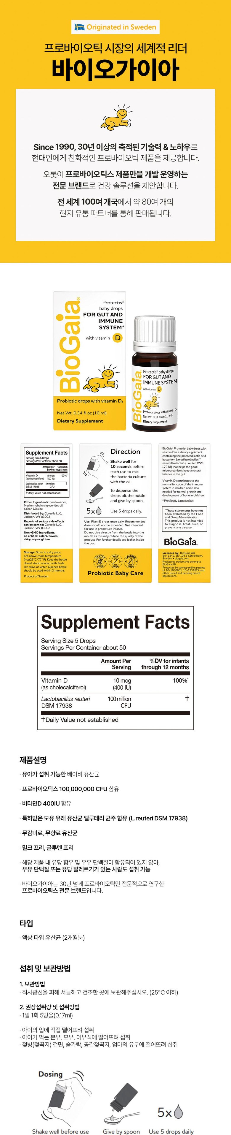 어린이의 건강을 위한 프로바이오틱 보충제입니다. 매일 5방울만 섭취하면 1억 마리의 생균을 제공합니다.