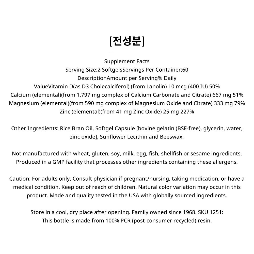 칼슘과 마그네슘에 비타민 D-3와 아연을 추가하여 필수 미네랄이 적절하게 혼합되어 있습니다. 소프트젤 제형입니다.