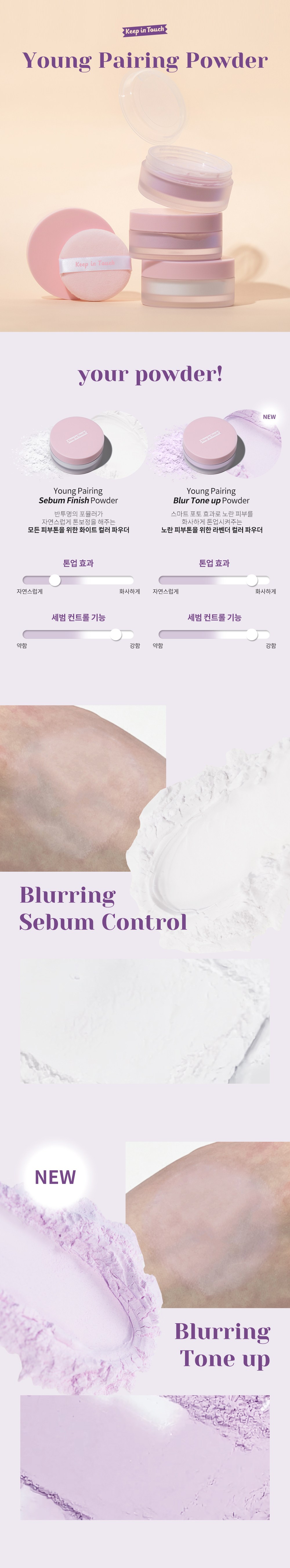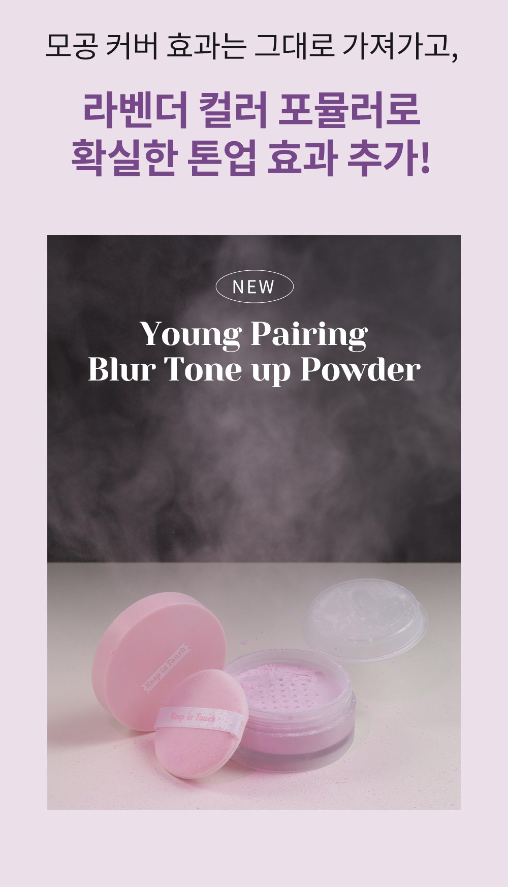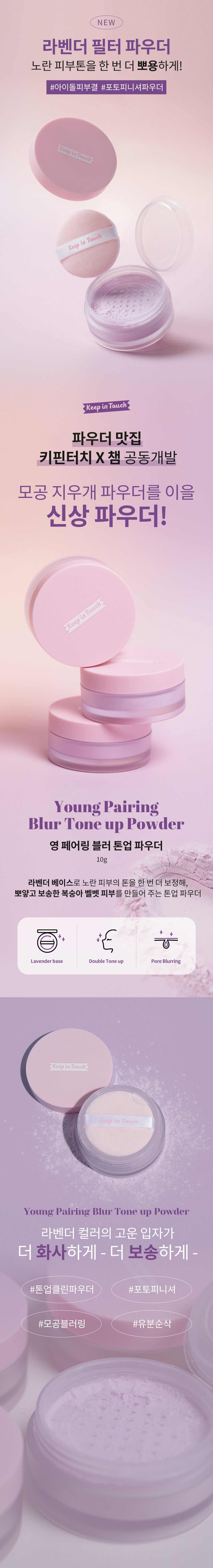 Keep In Touch Young Pairing控油定妝蜜粉,專為亞洲肌膚設計,能有效修飾膚色不均,打造自然柔焦妝感。薰衣草色調能提亮偏黃膚色,使肌膚呈現健康光澤。其控油配方能吸附多餘油脂,維持妝容持久度,告別油光滿面。細緻粉末能填補毛孔,使肌膚看起來更加平滑細緻。附有開關式內蓋,方便衛生。