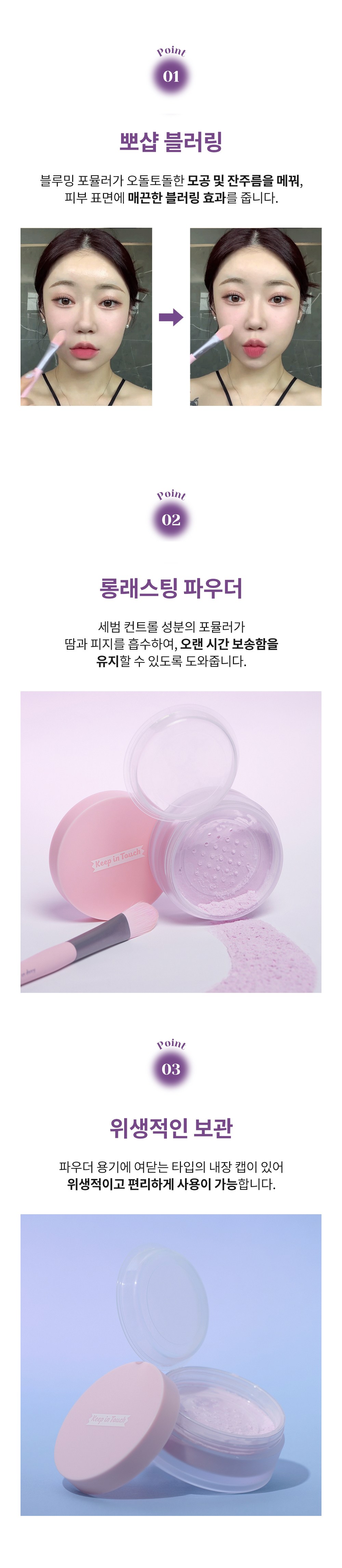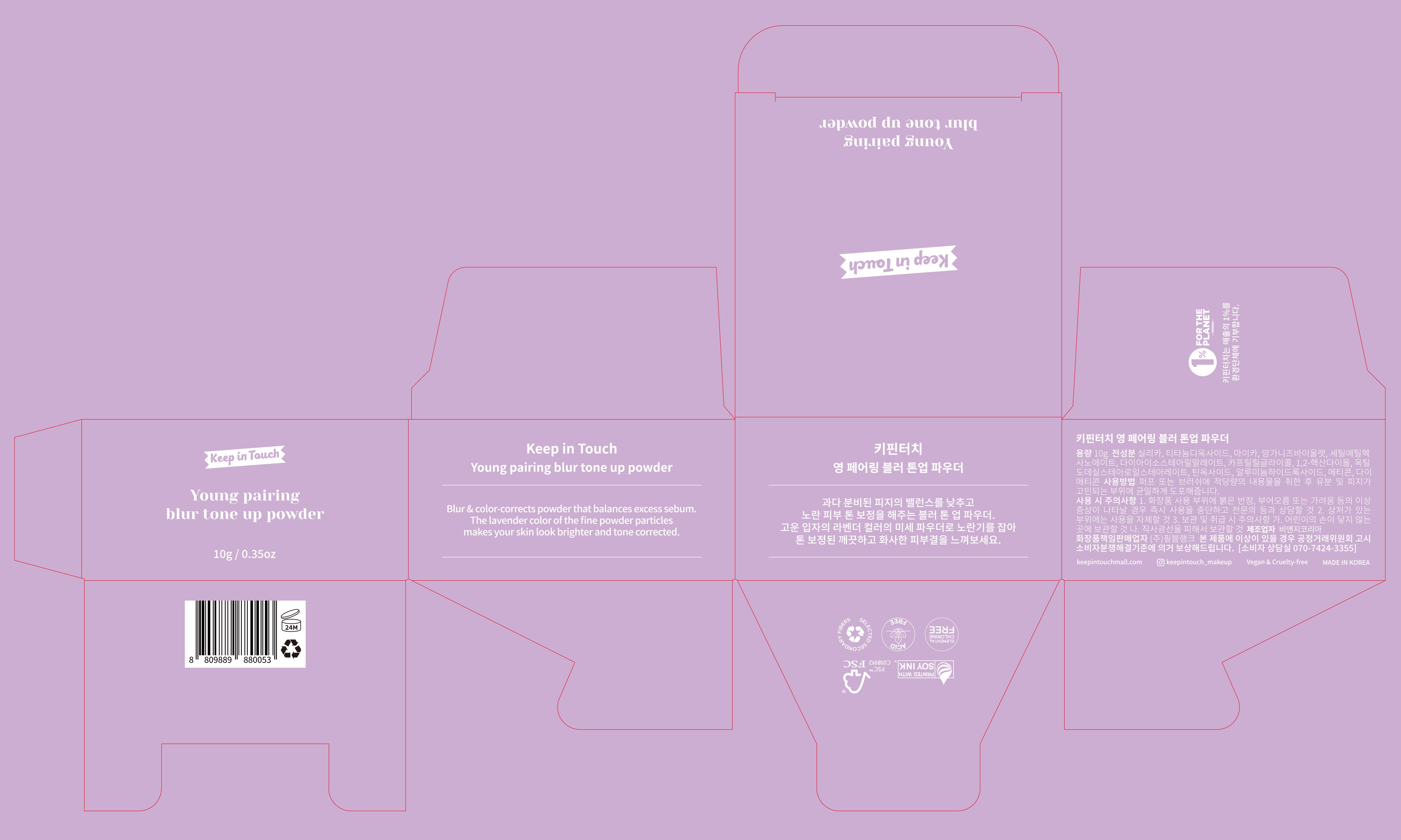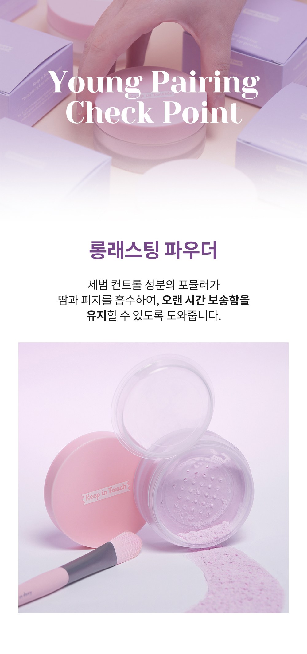 Keep In Touch Young Pairing控油定妝蜜粉,專為亞洲肌膚設計,能有效修飾膚色不均,打造自然柔焦妝感。薰衣草色調能提亮偏黃膚色,使肌膚呈現健康光澤。其控油配方能吸附多餘油脂,維持妝容持久度,告別油光滿面。細緻粉末能填補毛孔,使肌膚看起來更加平滑細緻。附有開關式內蓋,方便衛生。