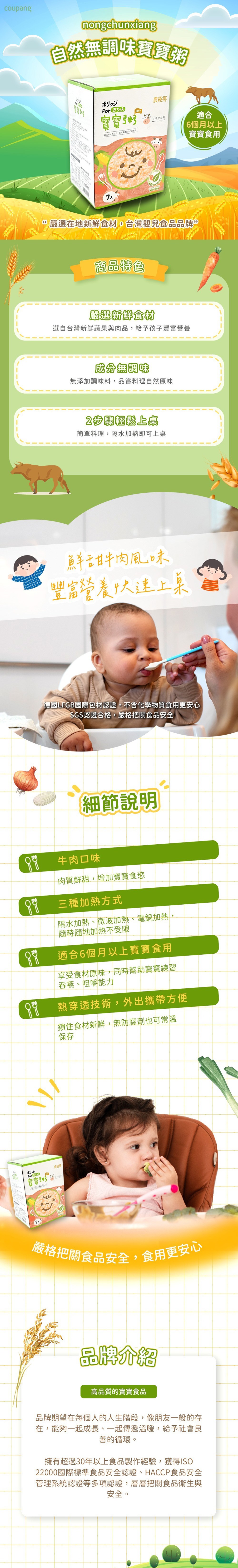 - 添加牛肉精華,富含寶寶成長所需的蛋白質,幫助寶寶健康發育,活力充沛每一天。