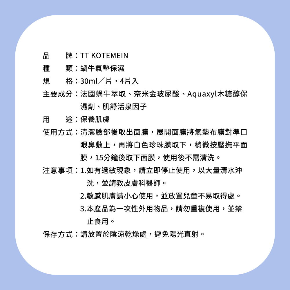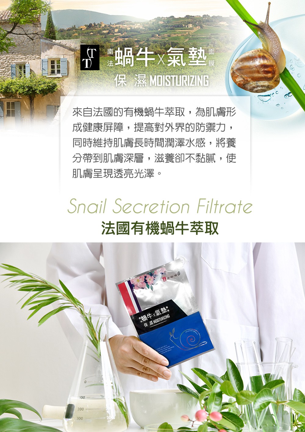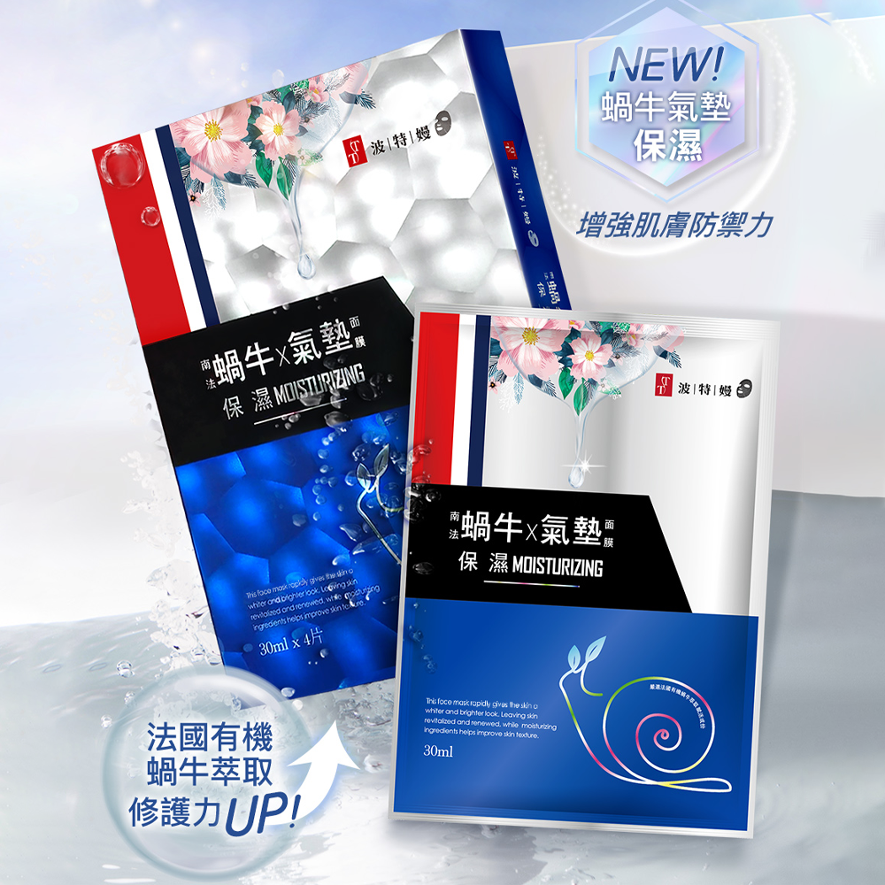 TT 波特嫚蝸牛氣墊保濕面膜,為您帶來水潤透亮的肌膚體驗,能有效形成肌膚保護屏障,提升對外界的防禦力。面膜採用獨特氣墊布膜,能緊密貼合臉部,將30ml滿滿的精華液均勻導入肌膚底層,深層滋養,使肌膚呈現水潤光澤。不含酒精,溫和呵護各種膚質,特別適合乾燥、缺水肌膚。每盒包含四片面膜,讓您隨時享受SPA級的保濕呵護。