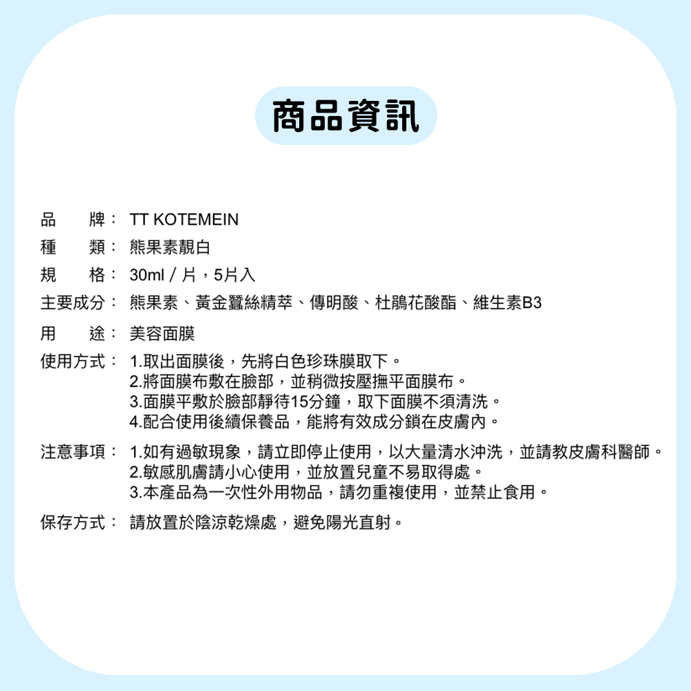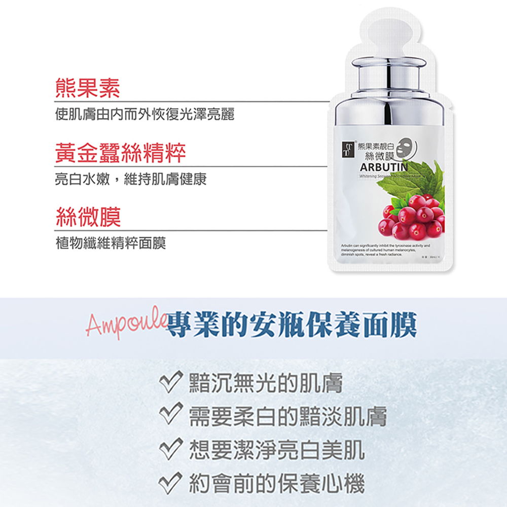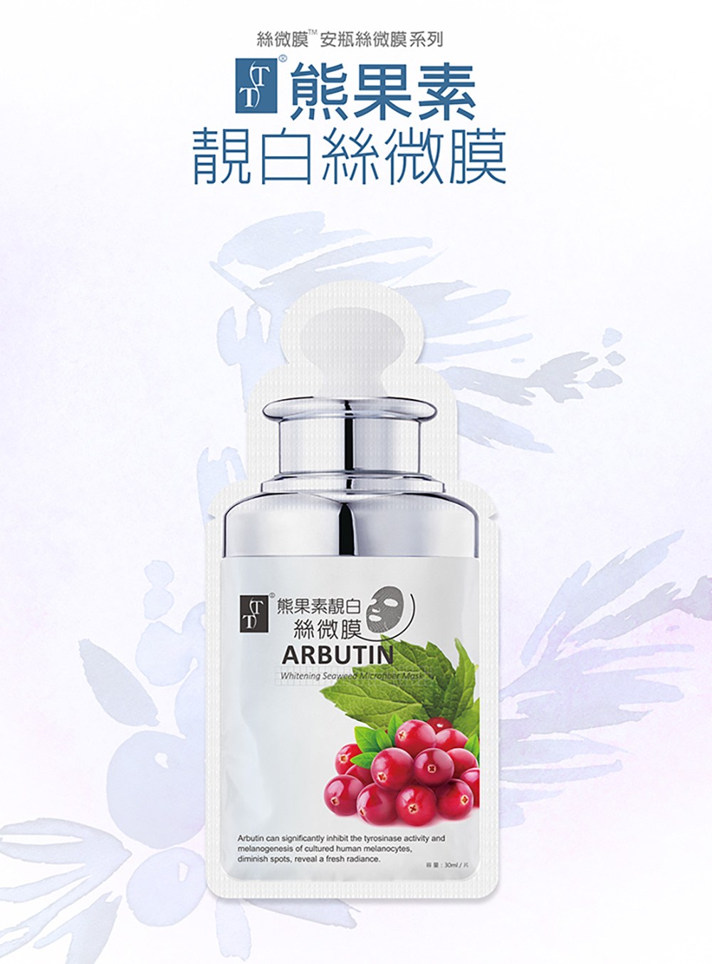 TT 波特嫚熊果素靚白絲微膜,專為追求透亮美肌的女性設計。每盒包含五片浸滿精華液的絲微膜面膜紙,能有效改善暗沉膚色,使肌膚由內而外恢復光澤亮麗。蘊含熊果素、黃金蠶絲精萃、傳明酸、杜鵑花酸酯及維生素B3等多種高效成分,深層滋養各種膚質,包括乾性、油性、混合性、敏感性及熟齡肌膚。使用後,肌膚將感受到水嫩透亮,重現健康光彩。不含酒精配方,溫和呵護,讓您安心享受每一次的保養時光。