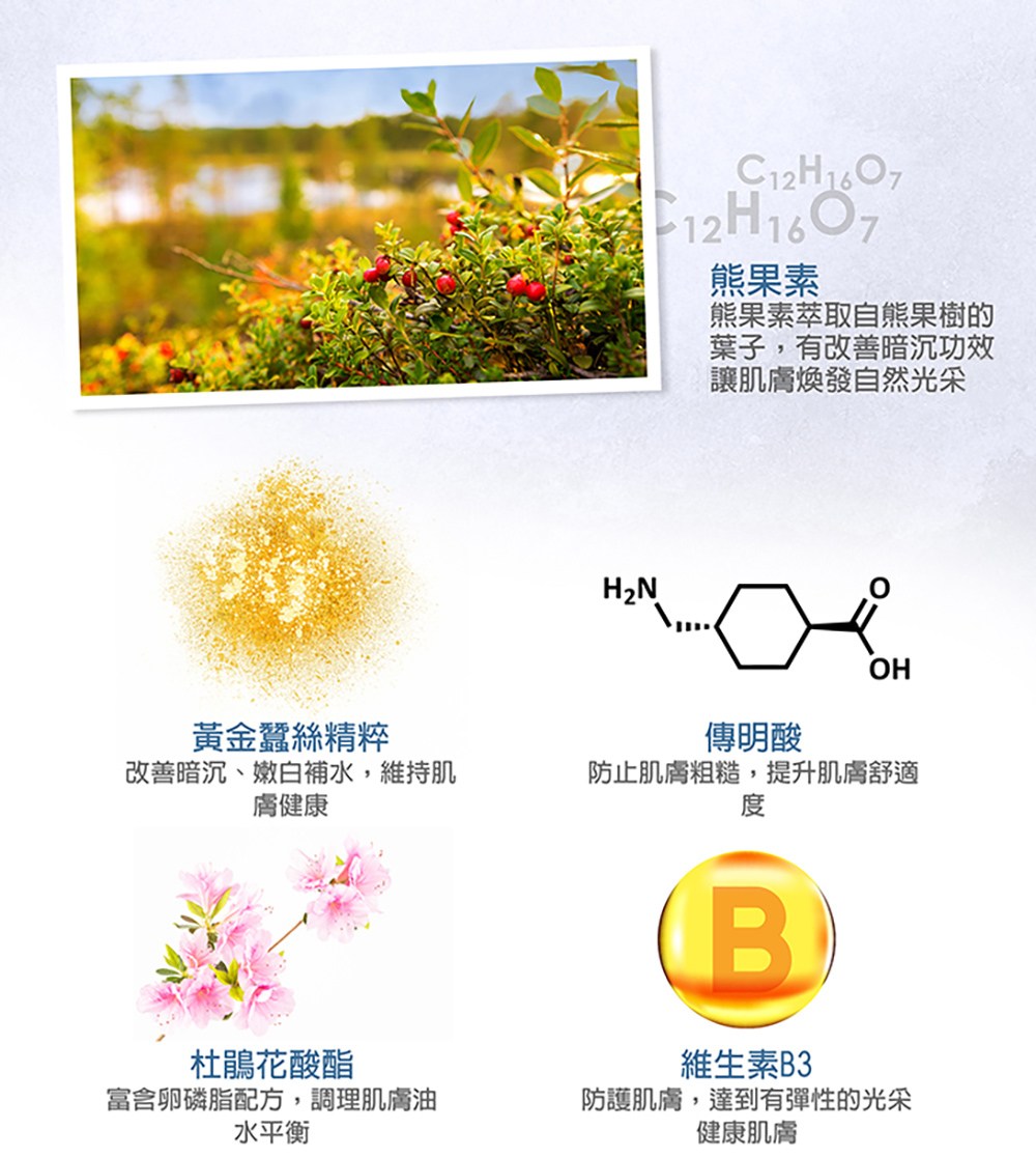 - 熊果素成分能有效提亮膚色,淡化暗沉,讓肌膚由內而外散發自然光澤,展現健康活力。
