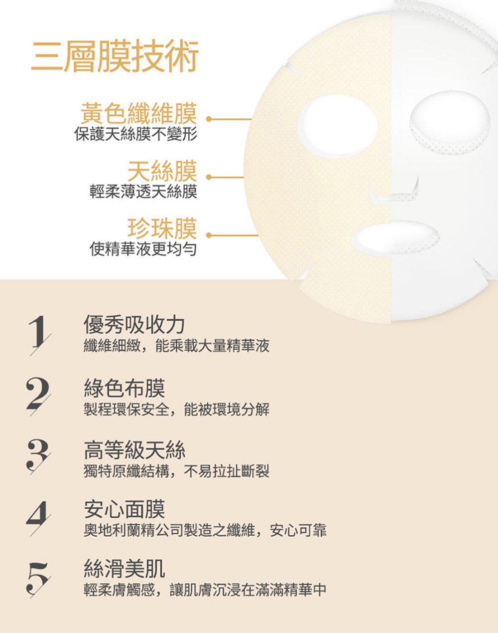 - - 天絲面膜材質,輕柔貼合臉部輪廓,給予肌膚舒適無感的呵護體驗。