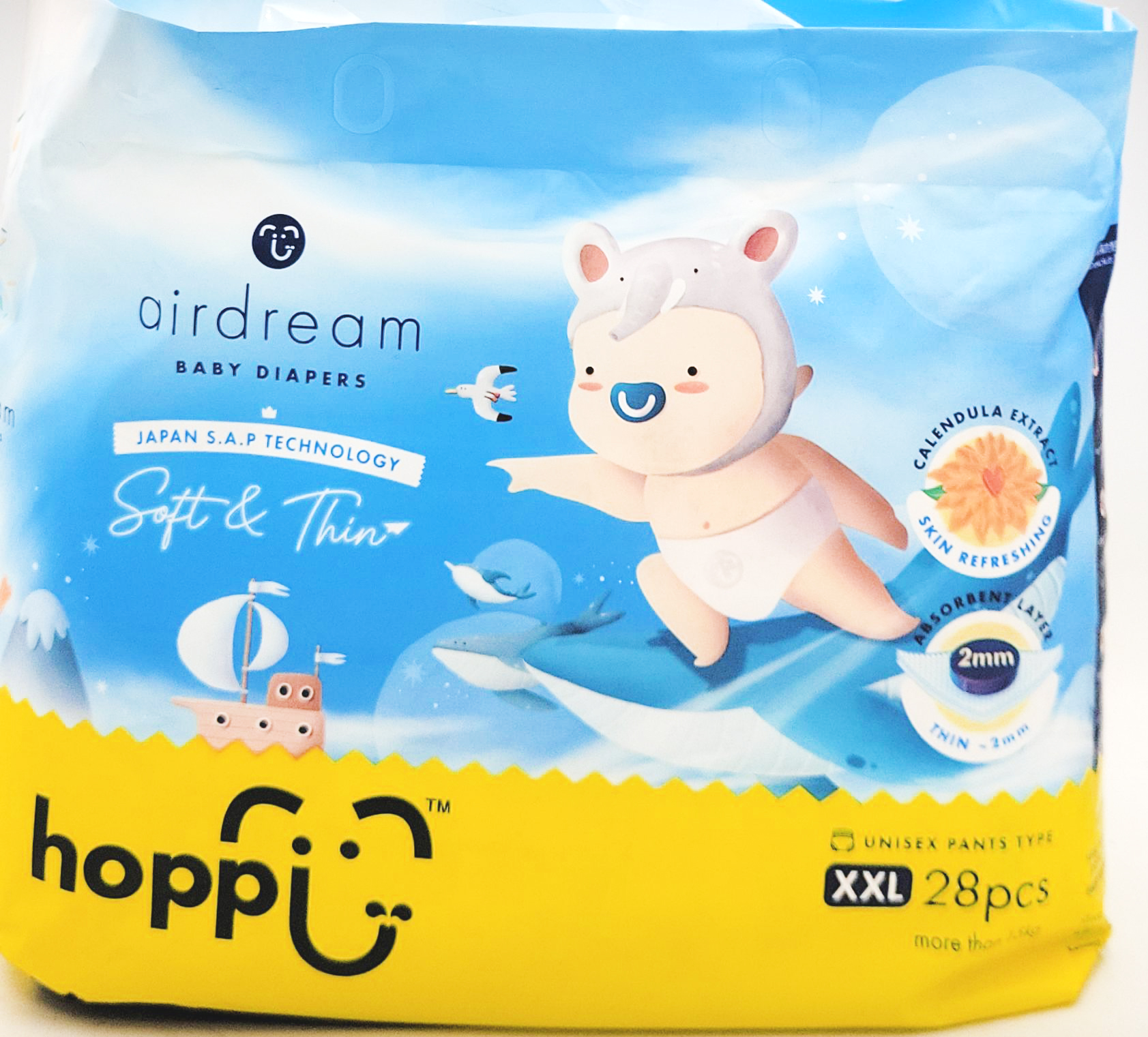 呵護寶寶嬌嫩肌膚,hoppi嬰兒拉拉褲給寶寶帶來乾爽舒適的體驗。這款褲型拉拉褲採用柔軟透氣材質,溫和呵護寶寶肌膚,讓寶寶四季皆宜,活動自如。XXL尺寸專為15公斤以上的寶寶設計,28片裝滿足媽媽們的需求。hoppi嬰兒拉拉褲採用日本S.A.P技術,超薄吸收層僅2mm,高效吸收尿液,長效乾爽,讓寶寶遠離紅屁屁。無氯配方,pH平衡,給寶寶最安心的呵護。