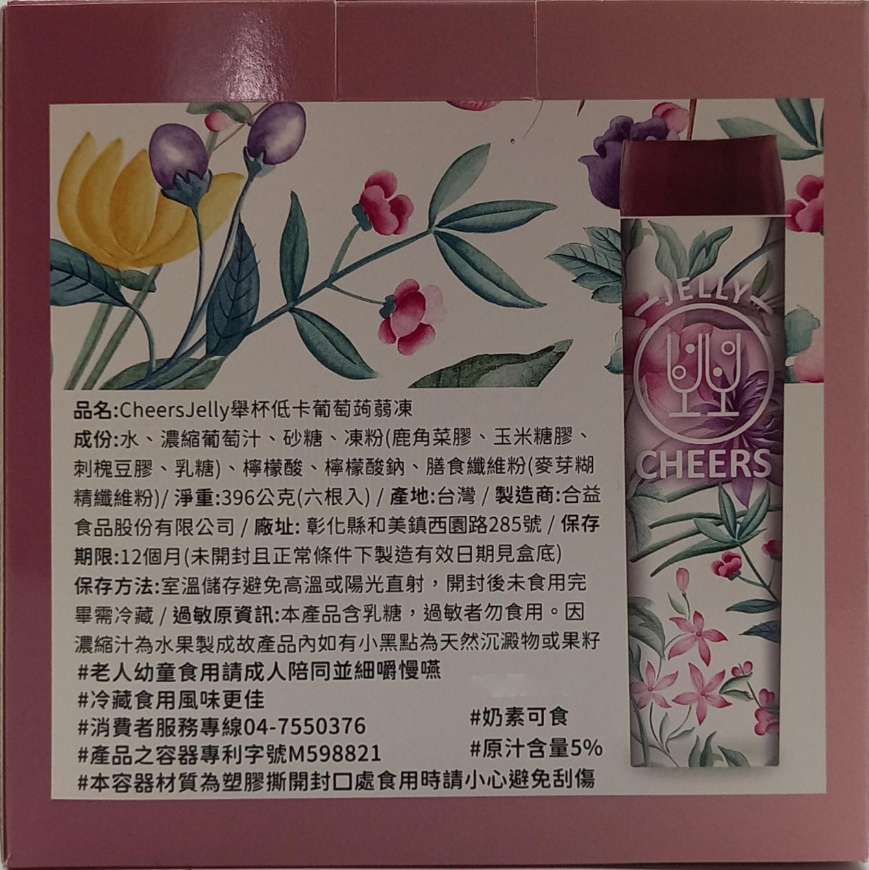 CHEERSJELLY 舉杯低卡蒟蒻凍,葡萄口味,是您健康零食的理想選擇。每盒包含6入66g的蒟蒻凍,讓您隨時享受葡萄的清甜滋味,同時又能兼顧低卡的需求。蒟蒻富含膳食纖維,有助於促進腸道蠕動,增加飽足感。無論是下午茶點心、辦公室零食,或是運動後的能量補充,CHEERSJELLY 都能滿足您的味蕾,讓您享受美味無負擔。蒟蒻凍口感Q彈,冰鎮後風味更佳,給您帶來清涼暢快的享受。