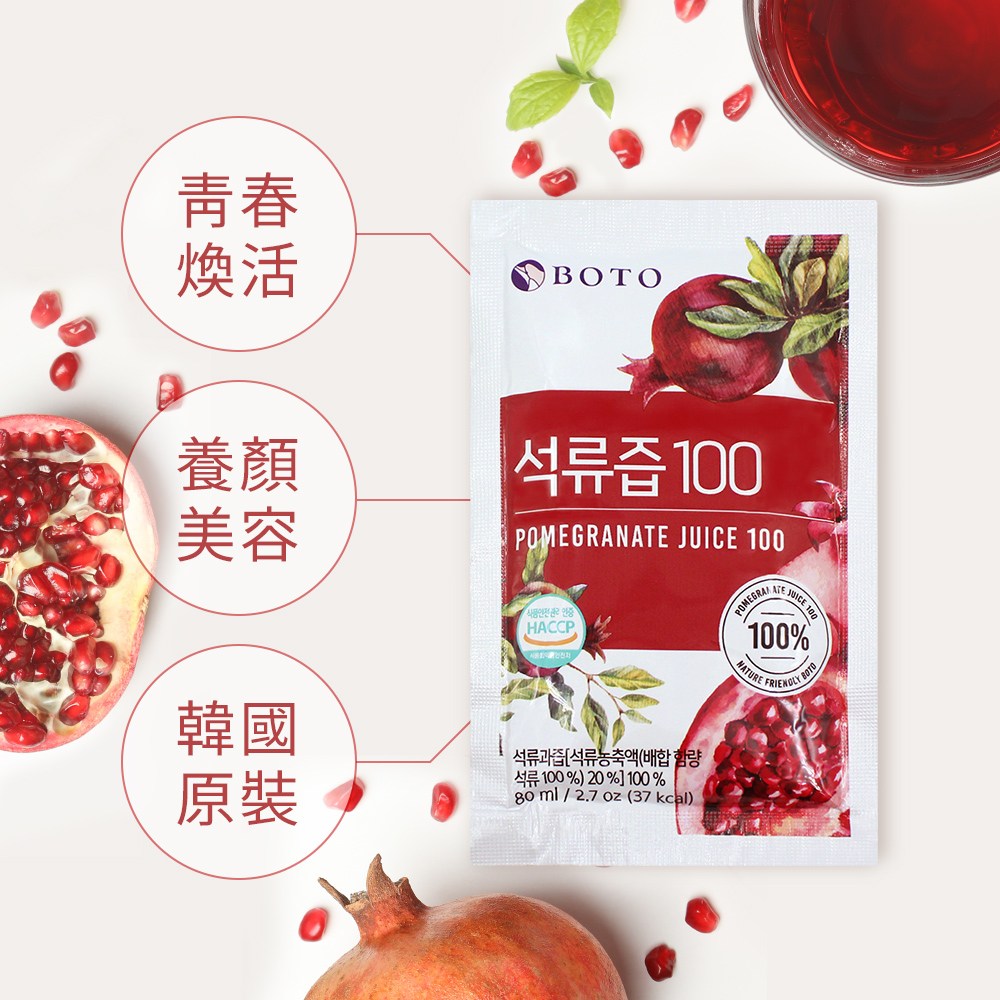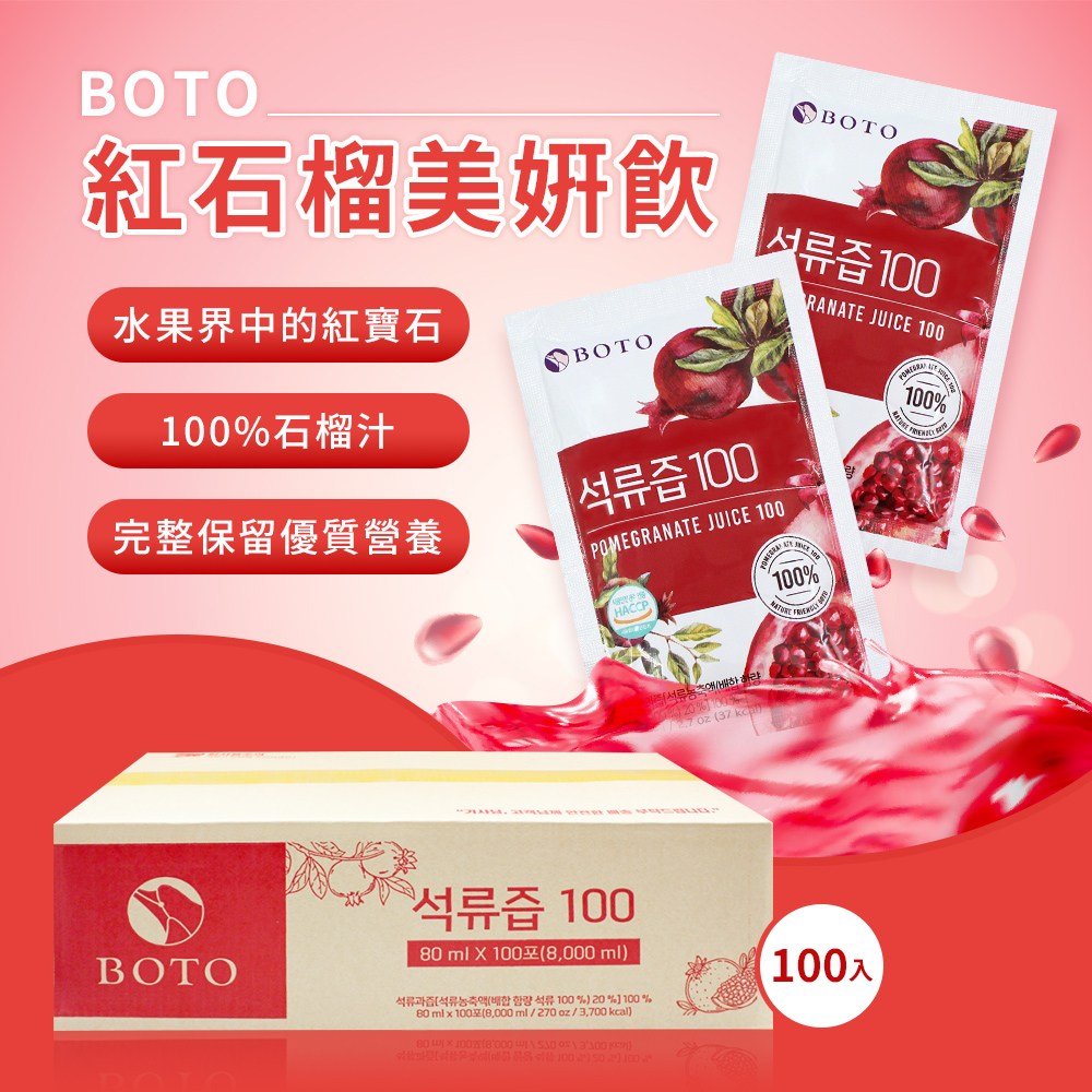 BOTO 紅石榴美顏飲,嚴選優質紅石榴。每包含有80ml的濃郁石榴精華,一箱共有100包,方便您隨時隨地享受美味與美麗。紅石榴富含多種維生素和抗氧化成分,有助於提升氣色,維持青春活力。獨立包裝設計,衛生又便於攜帶,讓您輕鬆補充每日所需營養,由內而外散發健康光彩。無論是忙碌的上班族還是注重養生的您,BOTO 紅石榴美顏飲都是您健康美麗的最佳選擇。