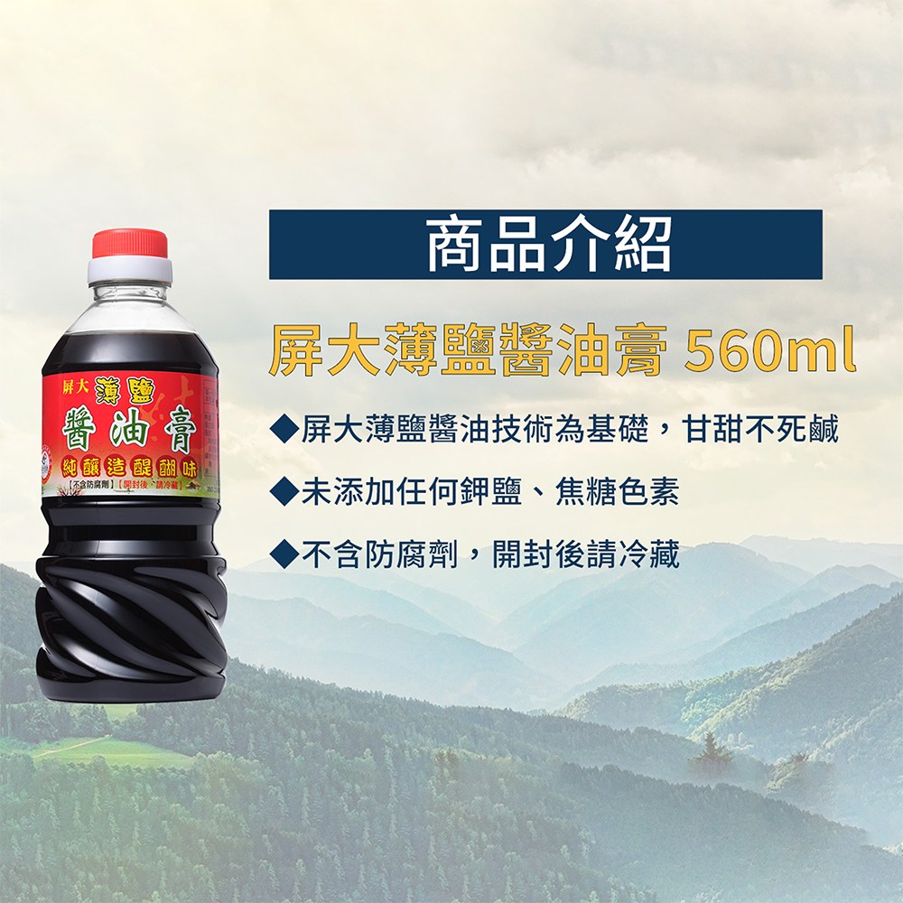 - 屏大薄鹽醬油膏,口感滑順,為您的料理增添豐富層次,輕鬆提升美味體驗。