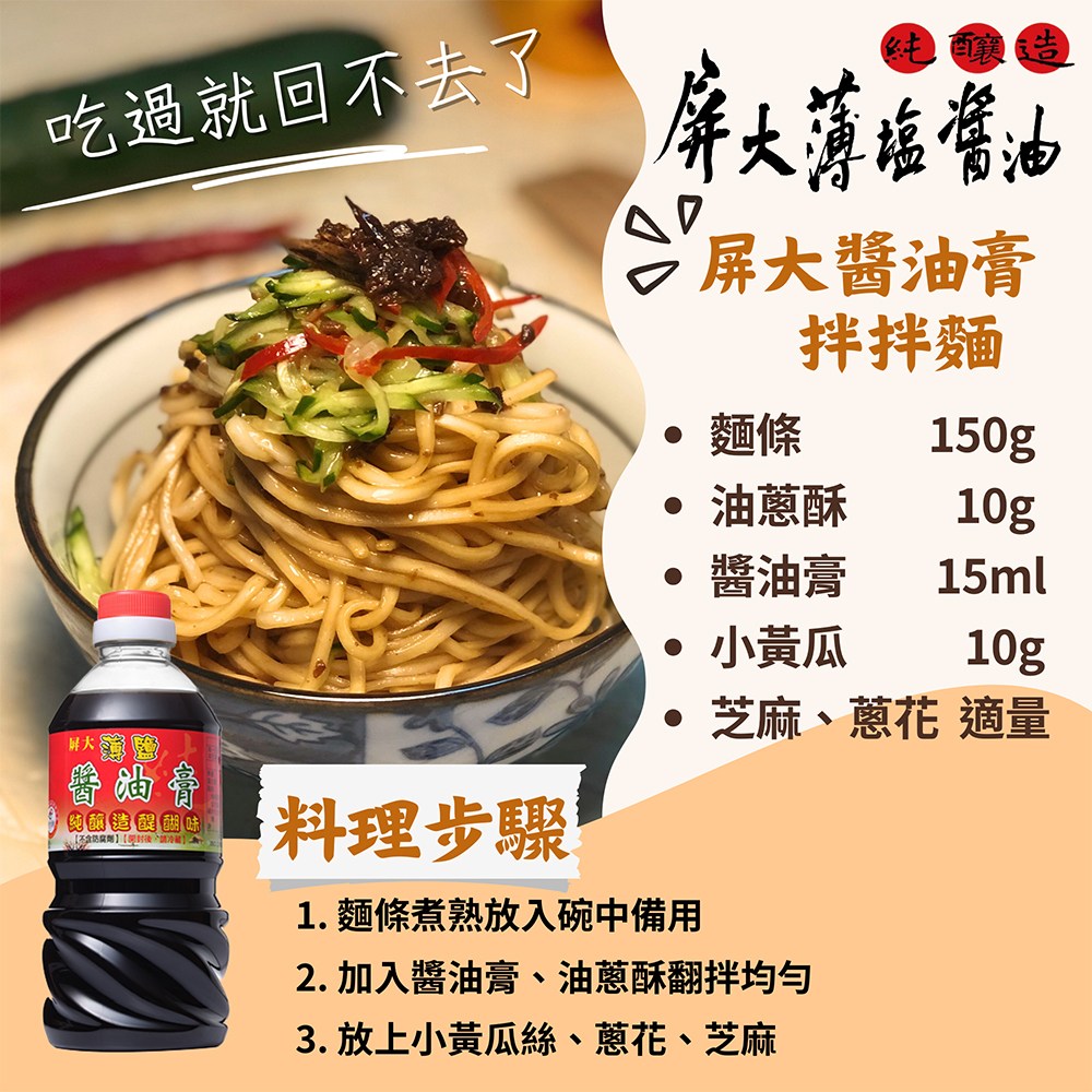 - 獨特醍醐味,屏大薄鹽醬油膏讓您在家也能輕鬆烹調出專業級的美味佳餚。