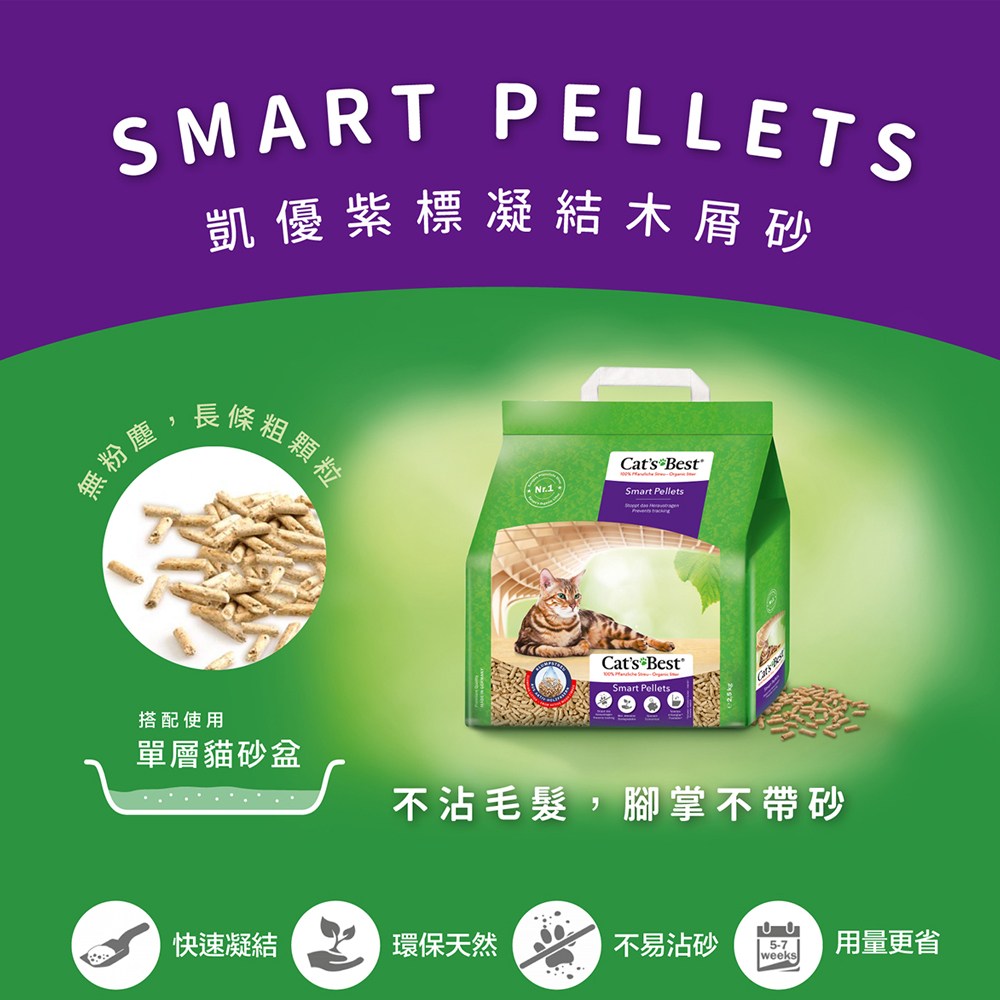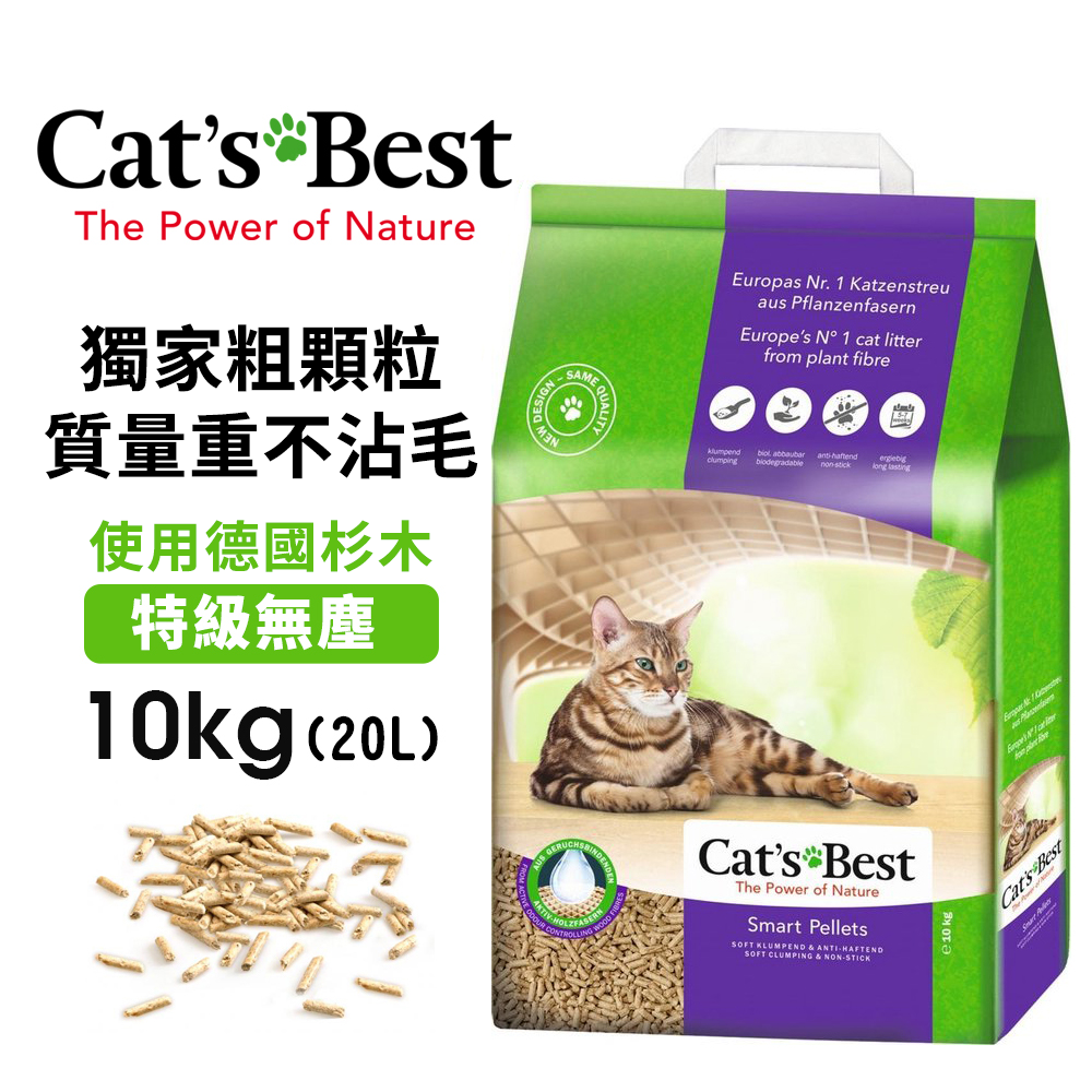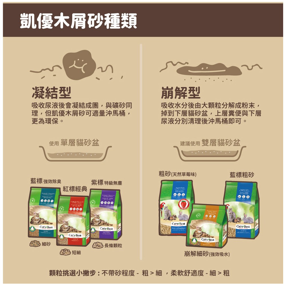 - Cat's Best紫標木屑砂,長條粗顆粒設計,讓貓咪在使用時不易沾黏毛髮,保持貓咪腳掌乾淨舒適。
