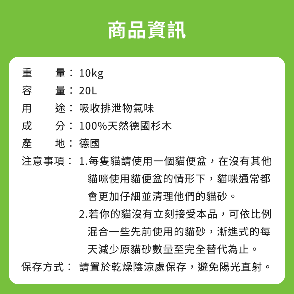 - 木屑砂遇水快速凝結成塊,方便清理貓砂盆,節省您的時間與精力,輕鬆維持環境衛生。