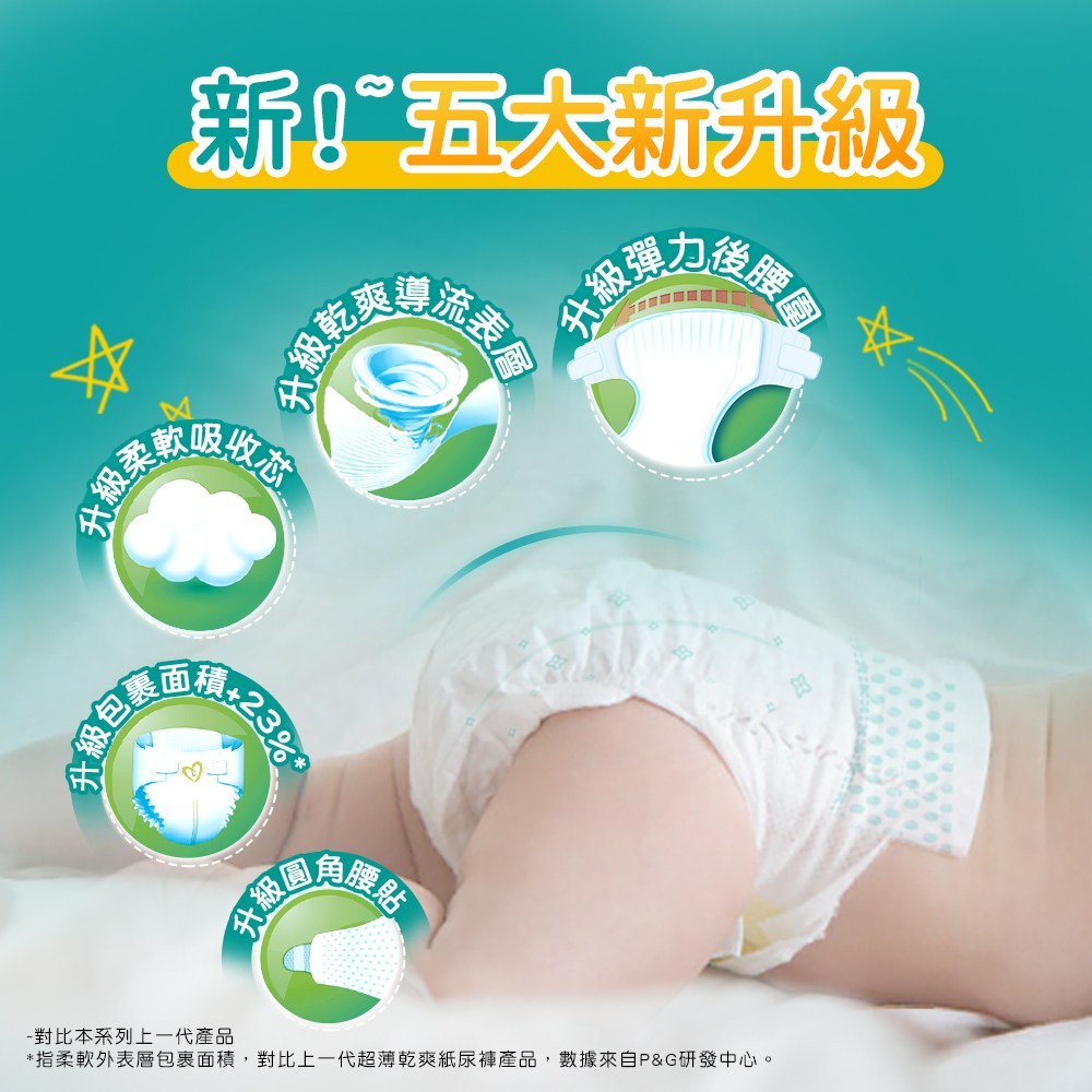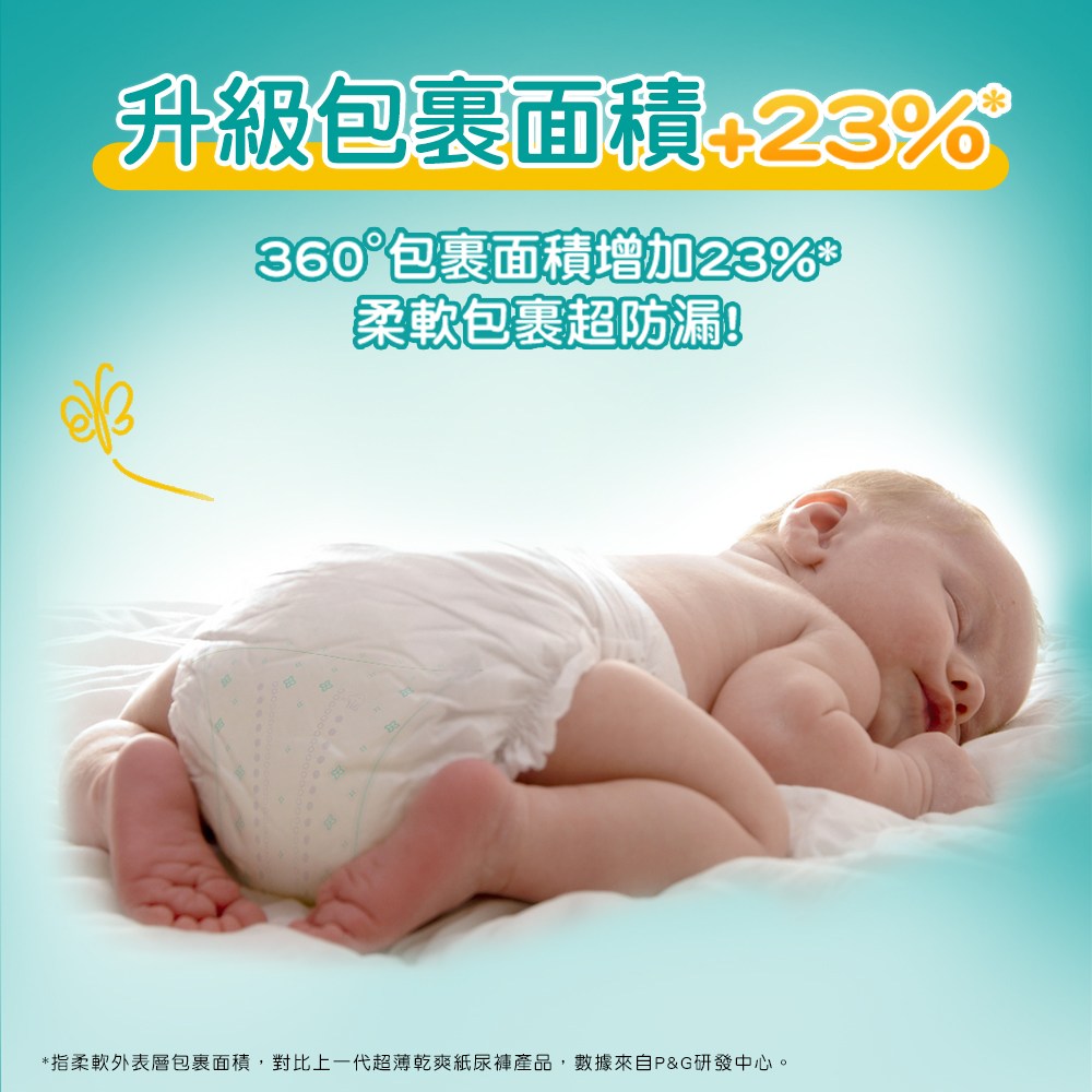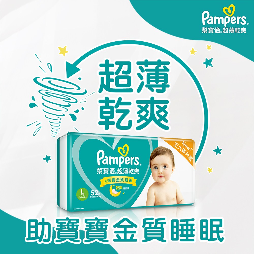 - 幫寶適超薄乾爽,給寶寶帶來整晚舒適睡眠,減少夜間醒來,讓寶寶睡得更香甜安穩。