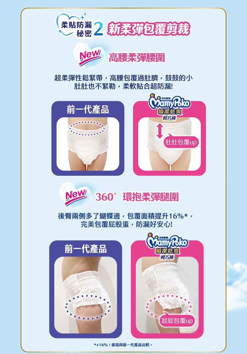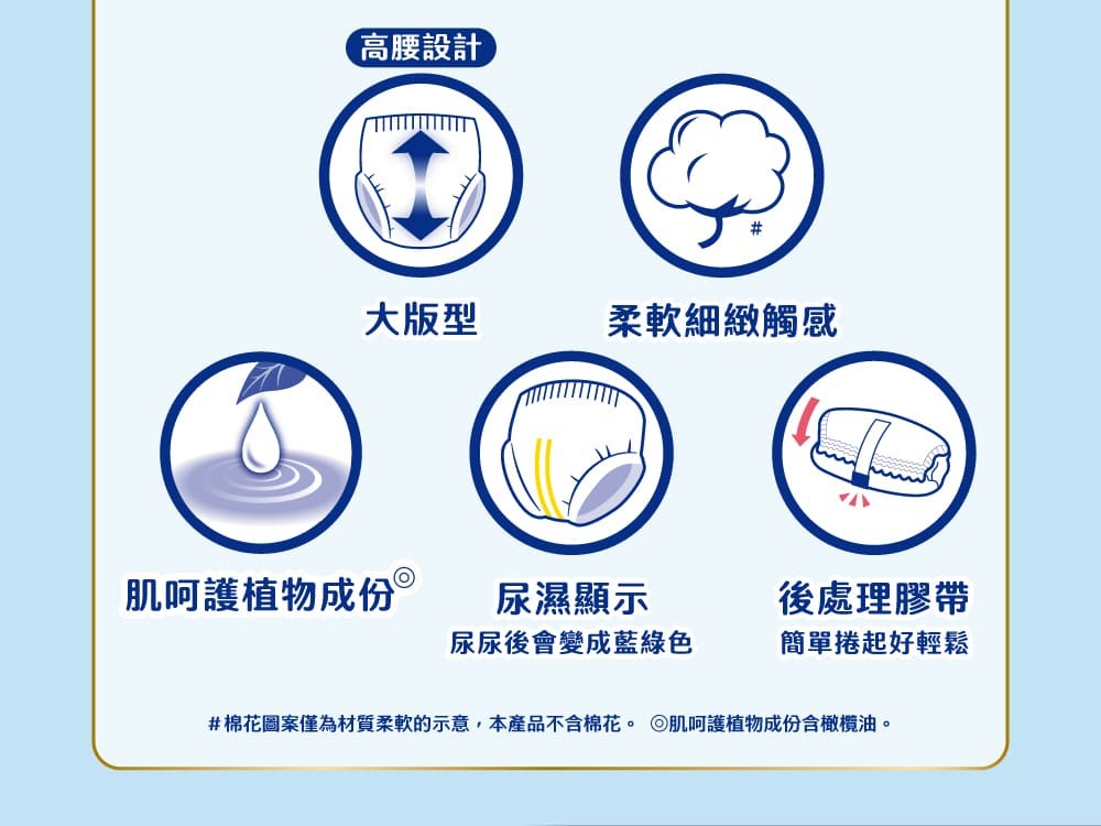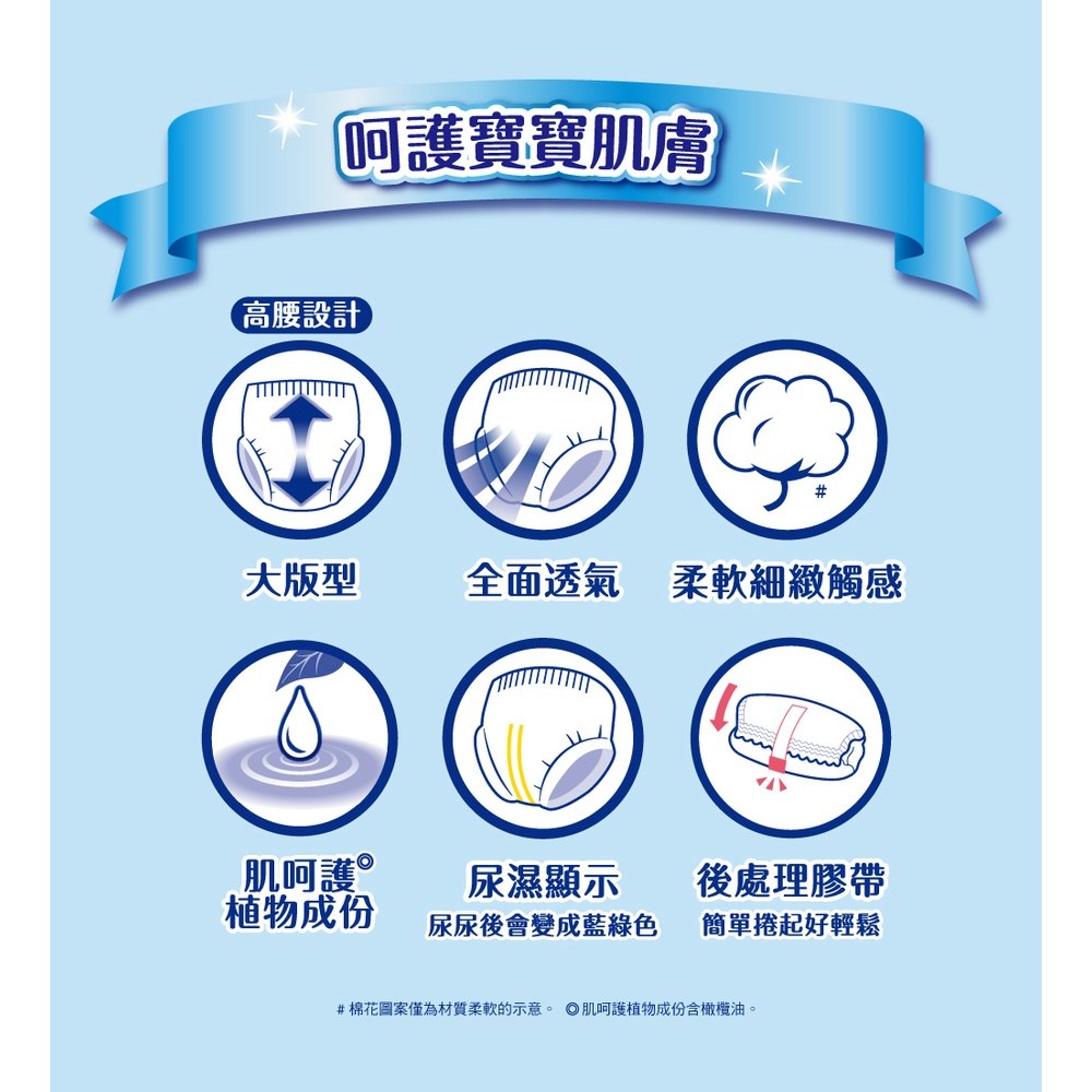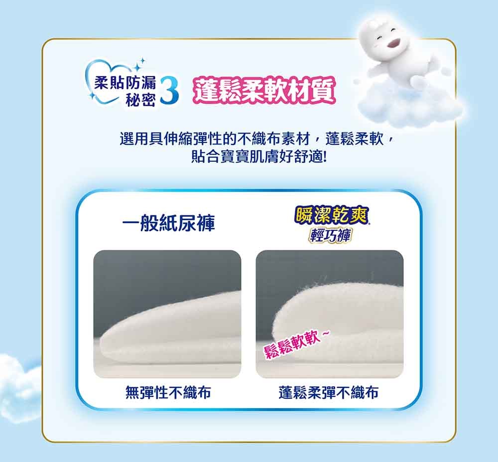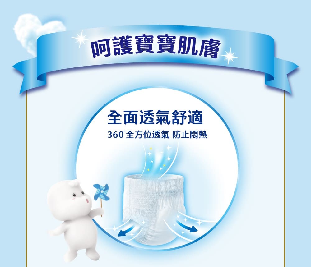 - 瞬潔乾爽設計,迅速吸收尿液,讓寶寶屁屁長時間保持乾爽舒適,減少紅屁屁的發生。