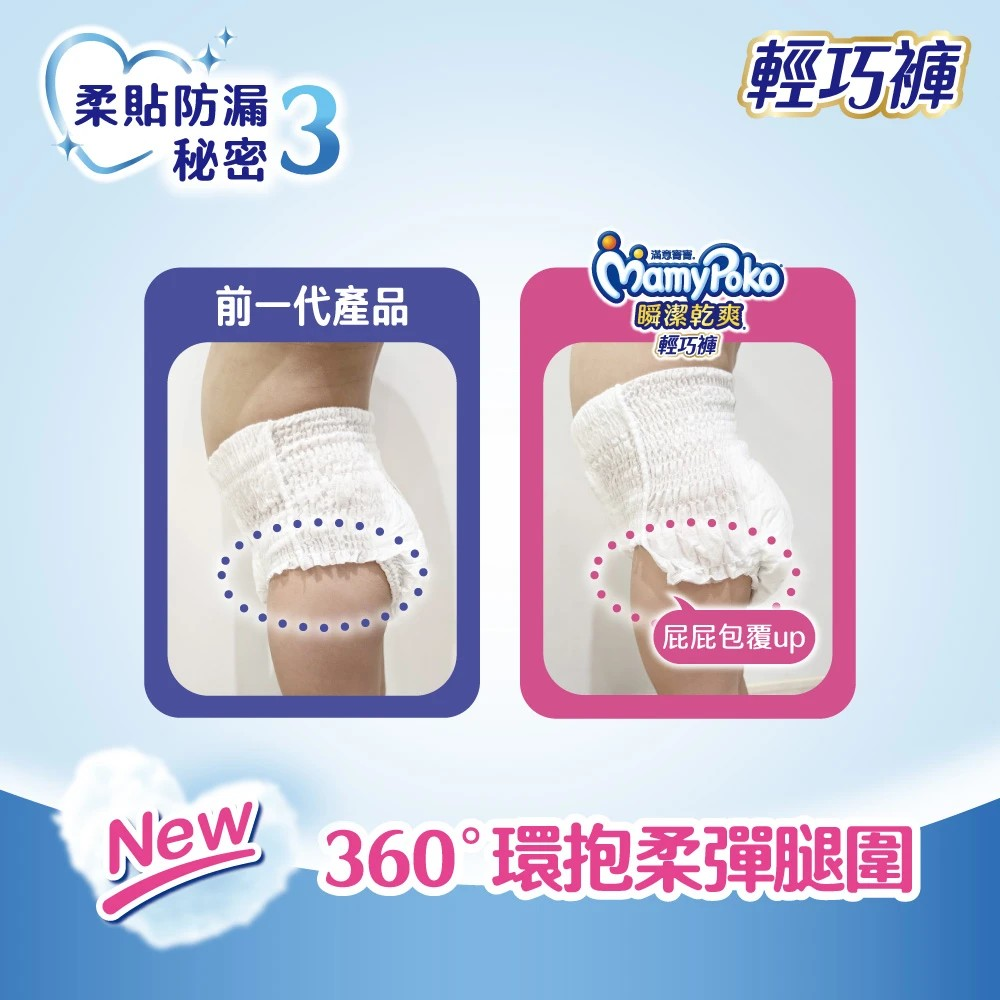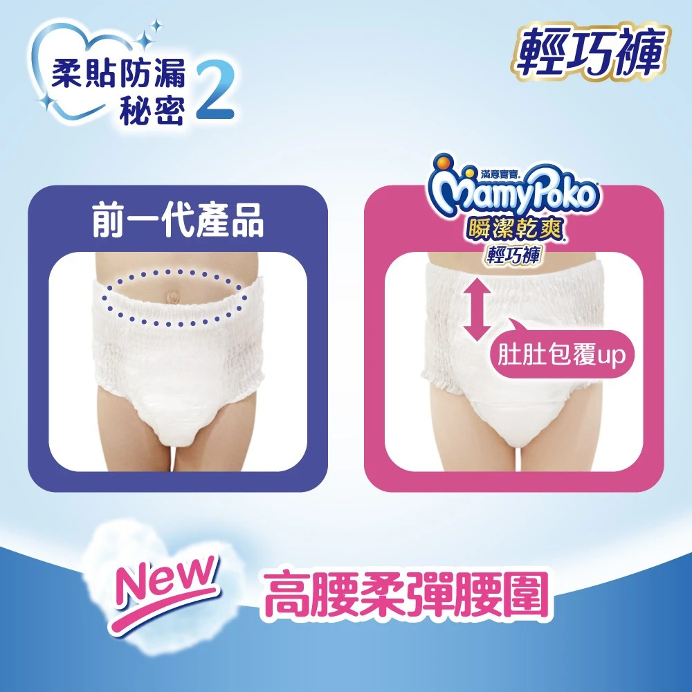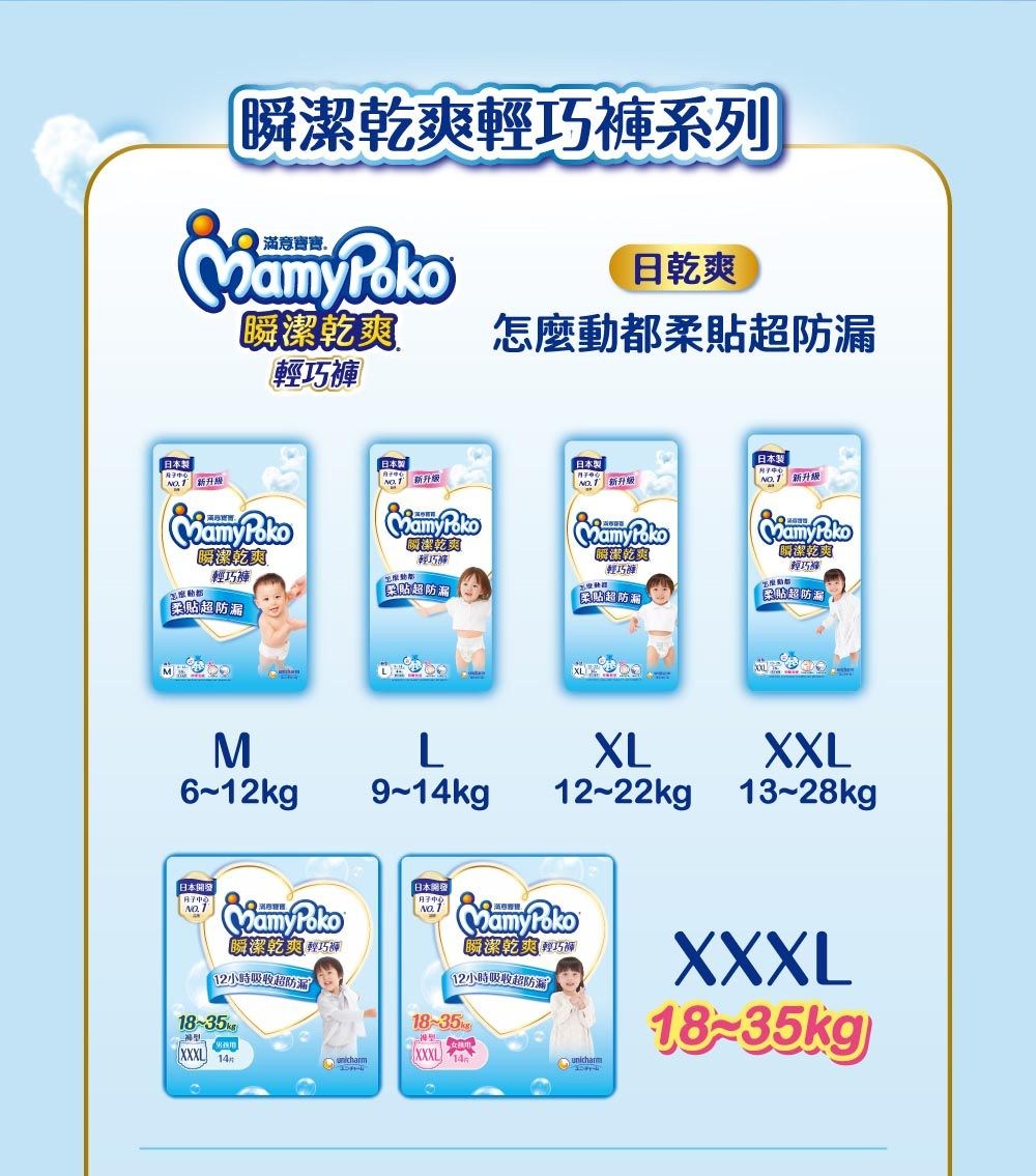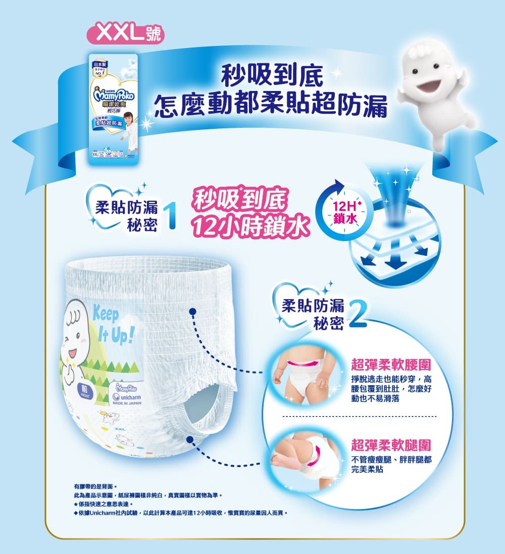 MamyPoko 滿意寶寶 瞬潔乾爽輕巧褲,讓寶寶享受全天候的乾爽舒適。這款褲型尿布專為13~28公斤的寶寶設計,XXL尺寸提供絕佳的包覆性,讓寶寶活動自如,怎麼動都超防漏。瞬潔乾爽技術迅速吸收尿液,減少紅屁屁的發生,讓寶寶的屁屁保持乾爽。男女寶寶皆適用,四季皆宜,一箱102片的超值包裝,讓您省時省力,給寶寶最安心的呵護。滿意寶寶,日本No.1品牌,品質值得信賴。
