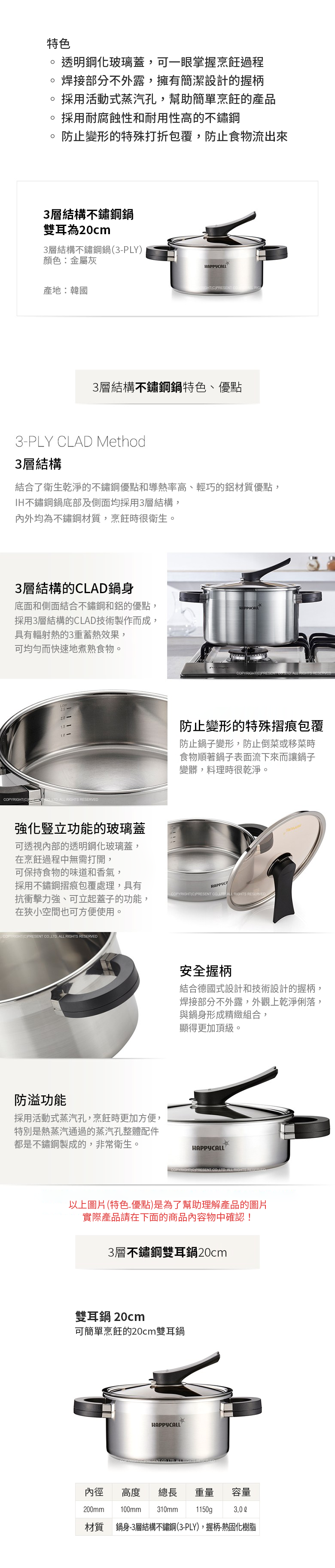 - HAPPYCALL雙耳鍋採用三層不鏽鋼結構,導熱快速且均勻,讓您輕鬆烹煮美味佳餚。