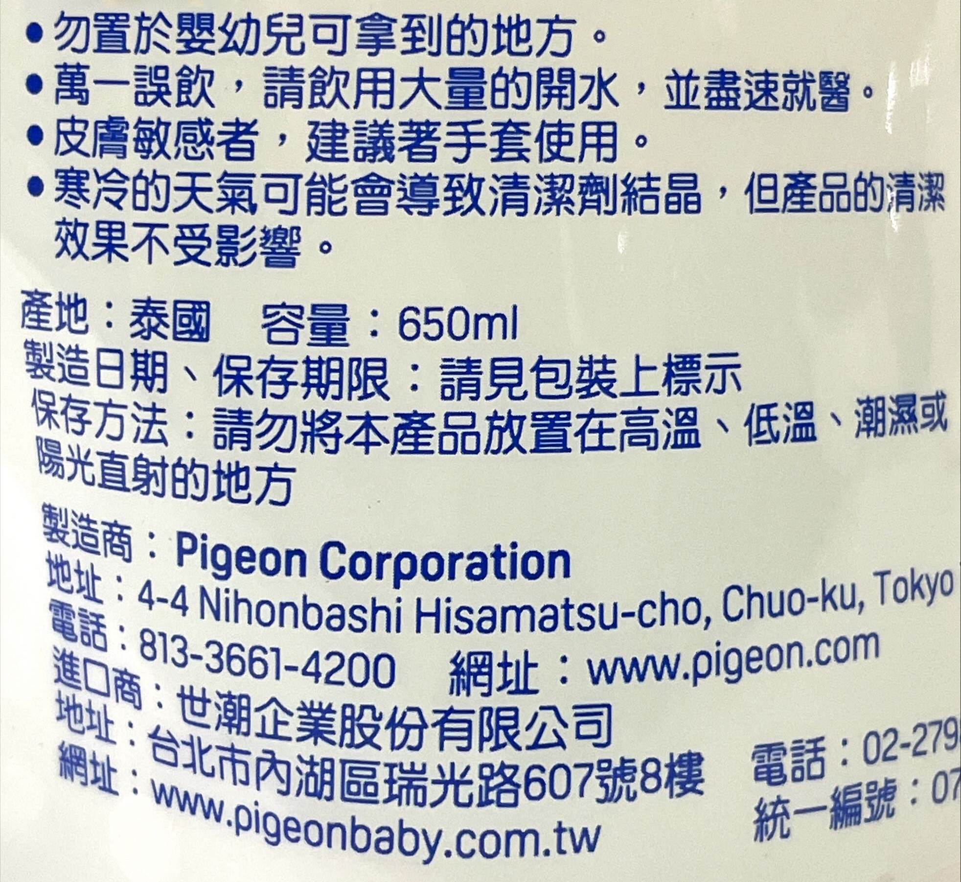 Pigeon 貝親奶瓶蔬果清潔液補充包,650ml大容量,是您呵護寶寶健康的首選。專為清潔奶瓶、奶嘴、餐具及蔬果設計,採用食品級成分,溫和不刺激,有效去除奶垢、食物殘渣及農藥等有害物質。本產品經皮膚測試,不易殘留,媽媽安心使用,節省資源,愛護地球。給寶寶最安全的呵護,從清潔開始!