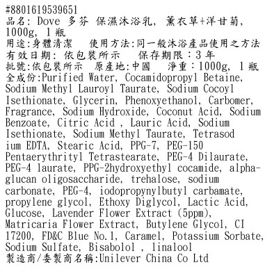 - 多芬保濕沐浴乳,溫和潔淨配方,洗後肌膚不乾澀,散發淡淡薰衣草香氣,放鬆身心。
