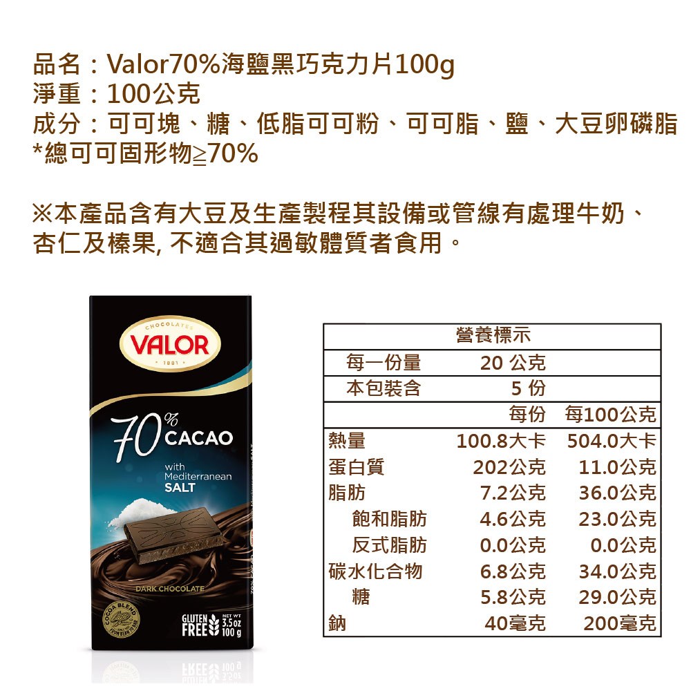 西班牙 VALOR 70%海鹽黑巧克力片, 100g, 3片